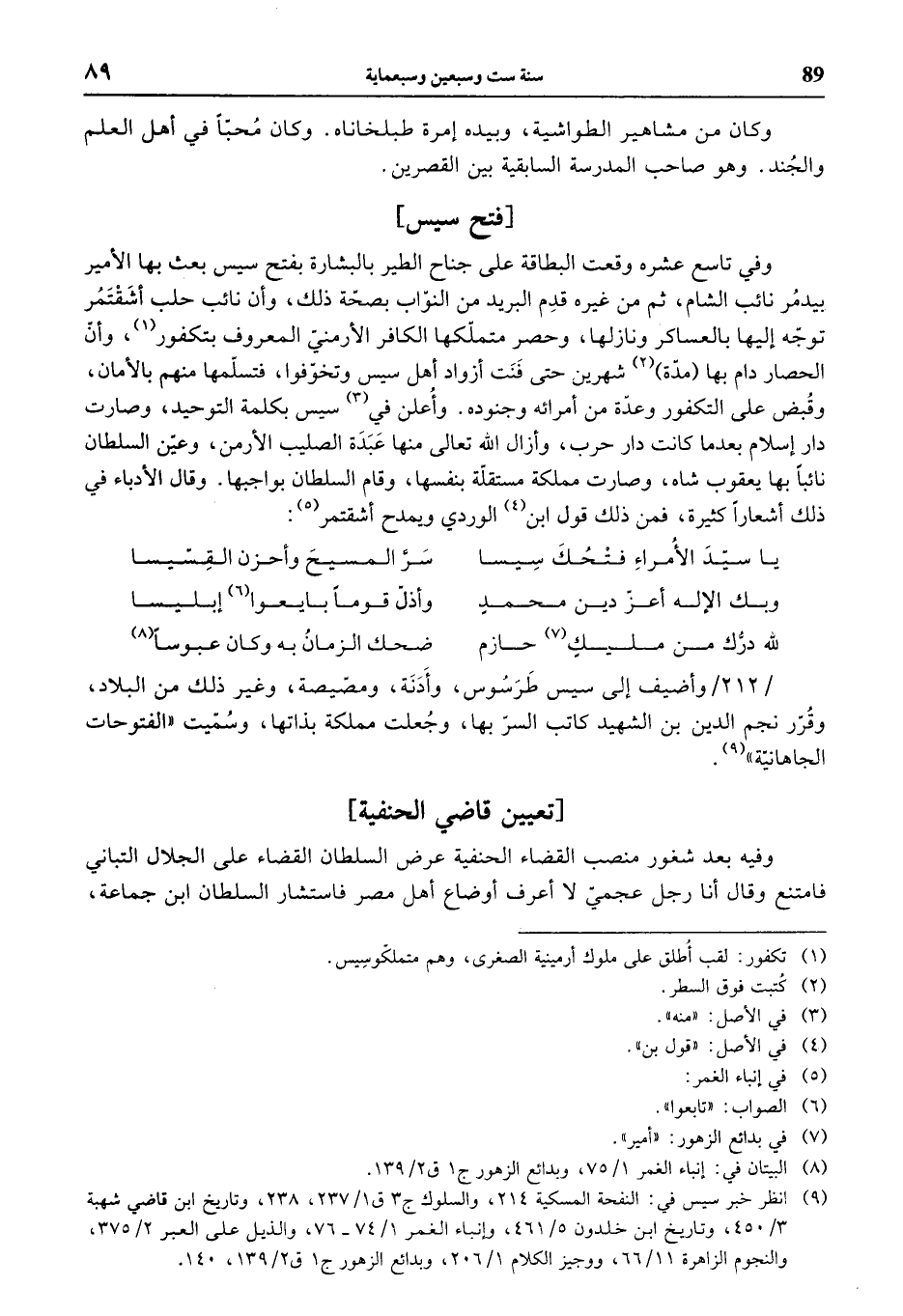(¬9) انظر خبر سيس في: النفحة المسكية 214، والسلوك ج 3 ق 1/ 237، 238، وتاريخ ابن قاضي شهبة 3/ 450، وتاريخ ابن خلدون 5/ 461، وإنباء الغمر 1/ 74 - 76، والذيل على العبر 2/ 375، والنجوم الزاهرة 11/ 66، ووجيز الكلام 1/ 206، وبدائع الزهور ج 1 ق 2/ 139، 140.