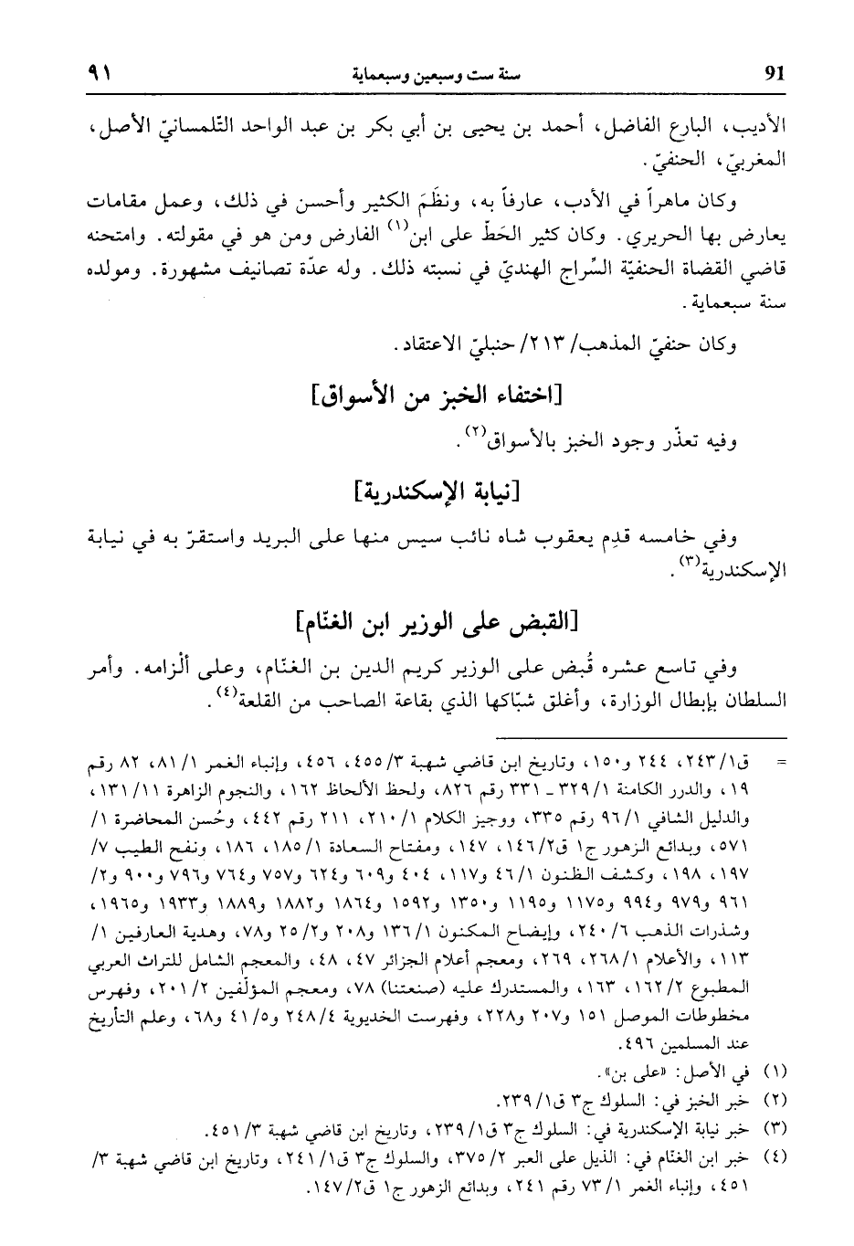 (¬4) خبر ابن الغنّام في: الذيل على العبر 2/ 375، والسلوك ج 3 ق 1/ 241، وتاريخ ابن قاضي شهبة 3/ 451، وإنباء الغمر 1/ 73 رقم 241، وبدائع الزهور ج 1 ق 2/ 147.