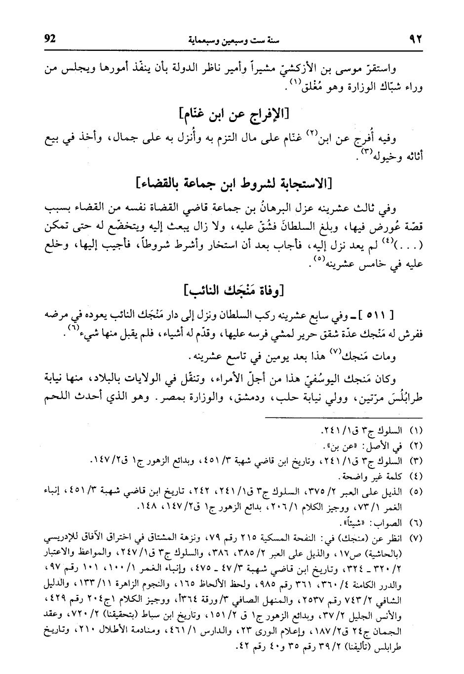 (¬7) انظر عن (منجك) في: النفحة المسكية 215 رقم 79، ونزهة المشتاق في اختراق الآفاق للإدريسي (بالحاشية) ص 17، والذيل على العبر 2/ 385، 386، والسلوك ج 3 ق 1/ 247، والمواعظ والاعتبار 2/ 320 - 324، وتاريخ ابن قاضي شهبة 3/ 47 - 475، وإنباء الغمر 1/ 100، 101 رقم 97، والدرر الكامنة 4/ 360، 361 رقم 985، ولحظ الألحاظ 165، والنجوم الزاهرة 11/ 133، والدليل الشافي 2/ 743 رقم 2537، والمنهل الصافي 3 / ورقة 364 أ، ووجيز الكلام 1 ج 204 رقم 429، والأنس الجليل 2/ 37، وبدائع الزهور ج 1 ق 2/ 151، وتاريخ ابن سباط (بتحقيقنا) 2/ 720، وعقد الجمان ج 24 ق 2/ 187، وإعلام الورى 23، والدارس 1/ 461، ومنادمة الأطلال 210، وتاريخ طرابلس (تأليفنا) 2/ 39 رقم 35 و 40 رقم 42.