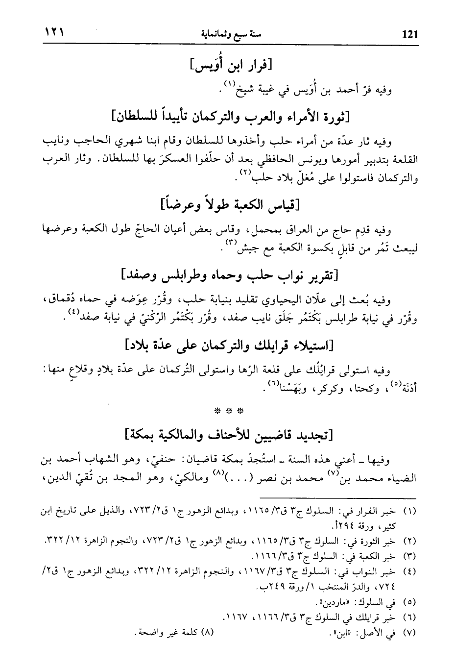 وفيه ثار عدّة من أمراء حلب وأخذوها للسلطان وقام ابنا شهري الحاجب ونايب القلعة بتدبير أمورها ويونس الحافظي بعد أن حلّفوا العسكر بها للسلطان. وثار العرب والتركمان فاستولوا على مغلّ بلاد حلب (¬2).