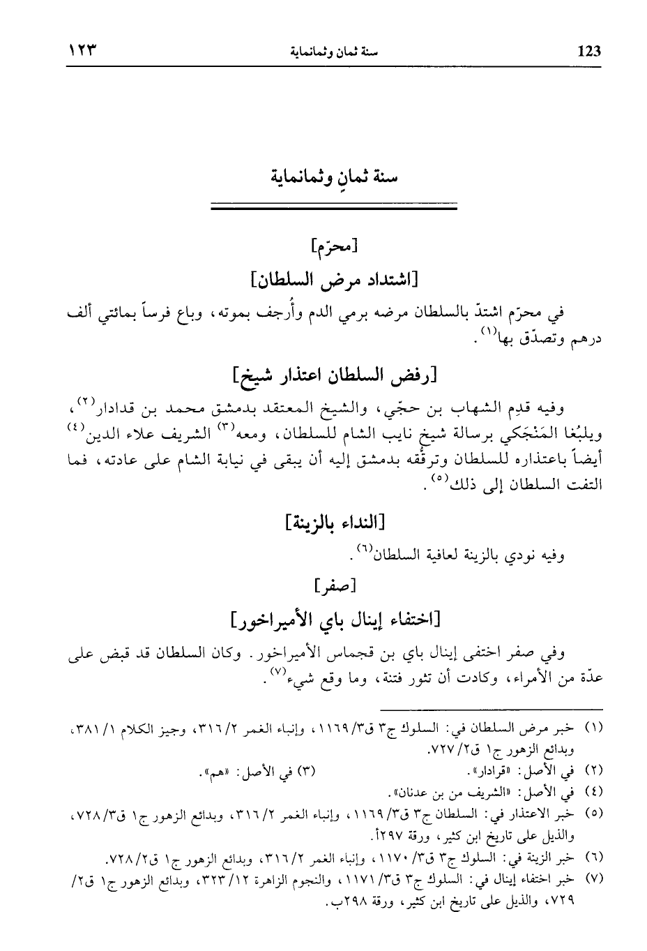 (¬5) خبر الاعتذار في: السلطان ج 3 ق 3/ 1169، وإنباء الغمر 2/ 316، وبدائع الزهور ج 1 ق 3/ 728، والذيل على تاريخ ابن كثير، ورقة 297 أ.