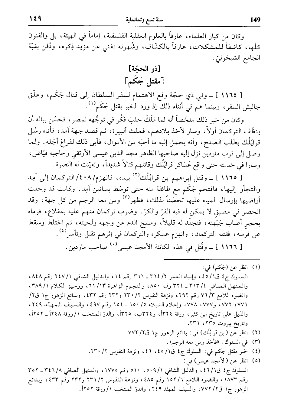 [1164]- وفي ذي حجّة وقع الاهتمام لسفر السلطان إلى قتال جكم، وعلّق جاليش السفر، وبينما هم في أثناء ذلك إذ ورد الخبر بقتل جكم (¬1).