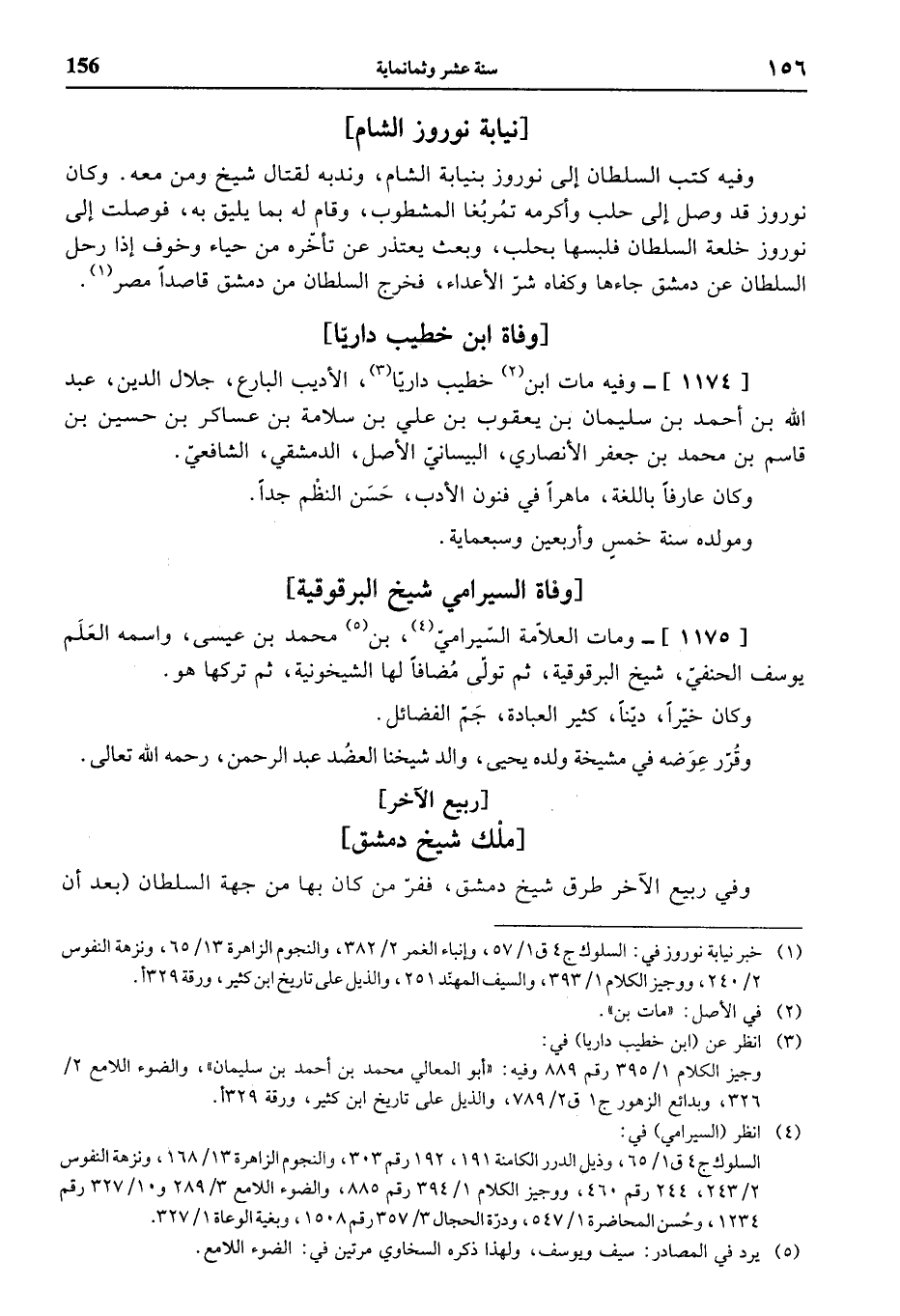 (¬3) انظر عن (ابن خطيب داريا) في: وجيز الكلام 1/ 395 رقم 889 وفيه: «أبو المعالي محمد بن أحمد بن سليمان»، والضوء اللامع 2/ 326، وبدائع الزهور ج 1 ق 2/ 789، والذيل على تاريخ ابن كثير، ورقة 329 أ.
