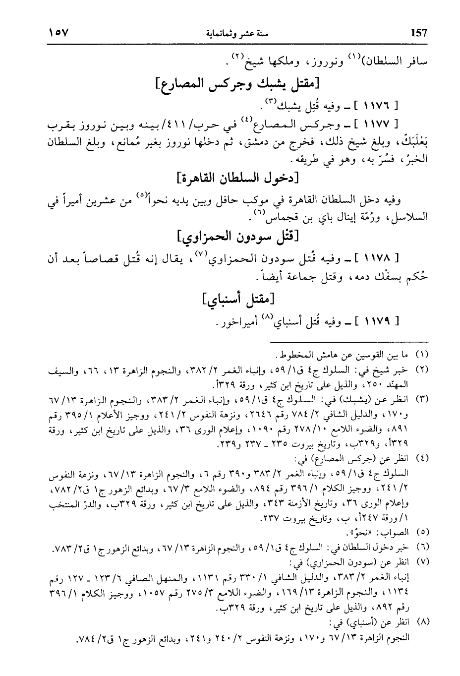 [1177]- وجركس المصارع (¬4) في حرب / 411 / بينه وبين نوروز بقرب بعلبكّ، وبلغ شيخ ذلك، فخرج من دمشق، ثم دخلها نوروز بغير ممانع، وبلغ السلطان الخبر، فسرّ به، وهو في طريقه.
