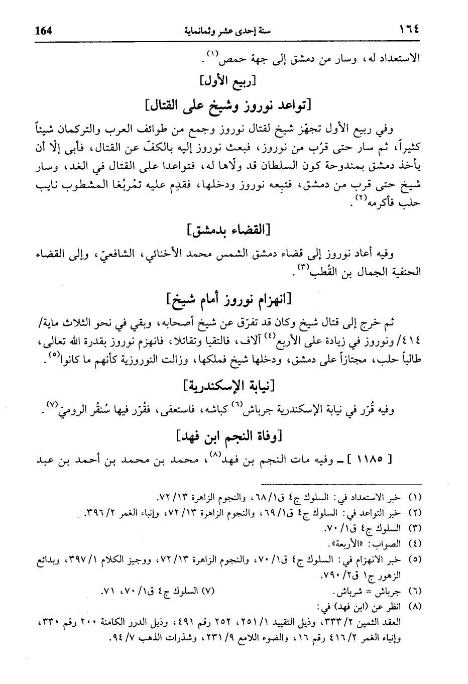 ثم خرج إلى قتال شيخ وكان قد تفرّق عن شيخ أصحابه، وبقي في نحو الثلاث ماية / 414 / ونوروز في زيادة على الأربع (¬4) آلاف، فالتقيا وتقاتلا، فانهزم نوروز بقدرة الله تعالى، طالبا حلب، مجتازا على دمشق، ودخلها شيخ فملكها، وزالت النوروزية كأنهم ما كانوا (¬5).