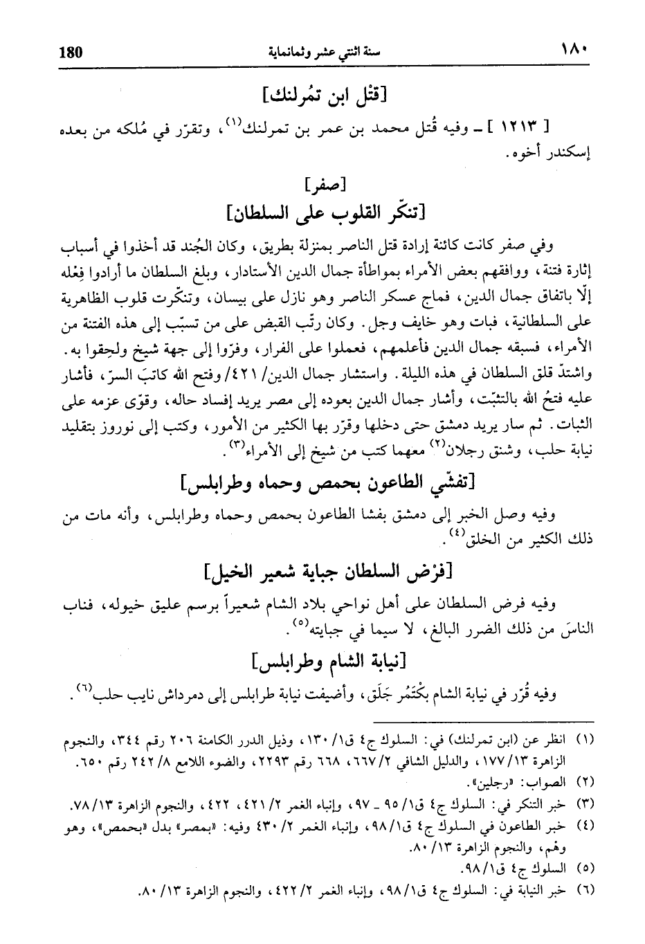 (¬1) انظر عن (ابن تمرلنك) في: السلوك ج 4 ق 1/ 130، وذيل الدرر الكامنة 206 رقم 344، والنجوم الزاهرة 13/ 177، والدليل الشافي 2/ 667، 668 رقم 2293، والضوء اللامع 8/ 242 رقم 650.