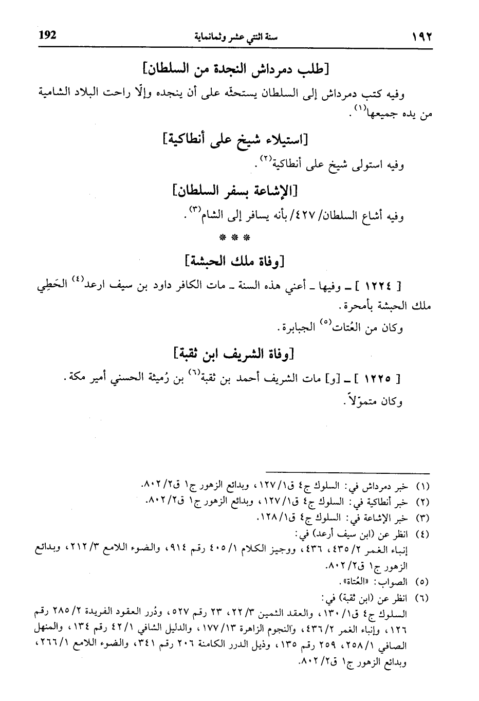 (¬4) انظر عن (ابن سيف أرعد) في: إنباء الغمر 2/ 435، 436، ووجيز الكلام 1/ 405 رقم 914، والضوء اللامع 3/ 212، وبدائع الزهور ج 1 ق 2/ 802.