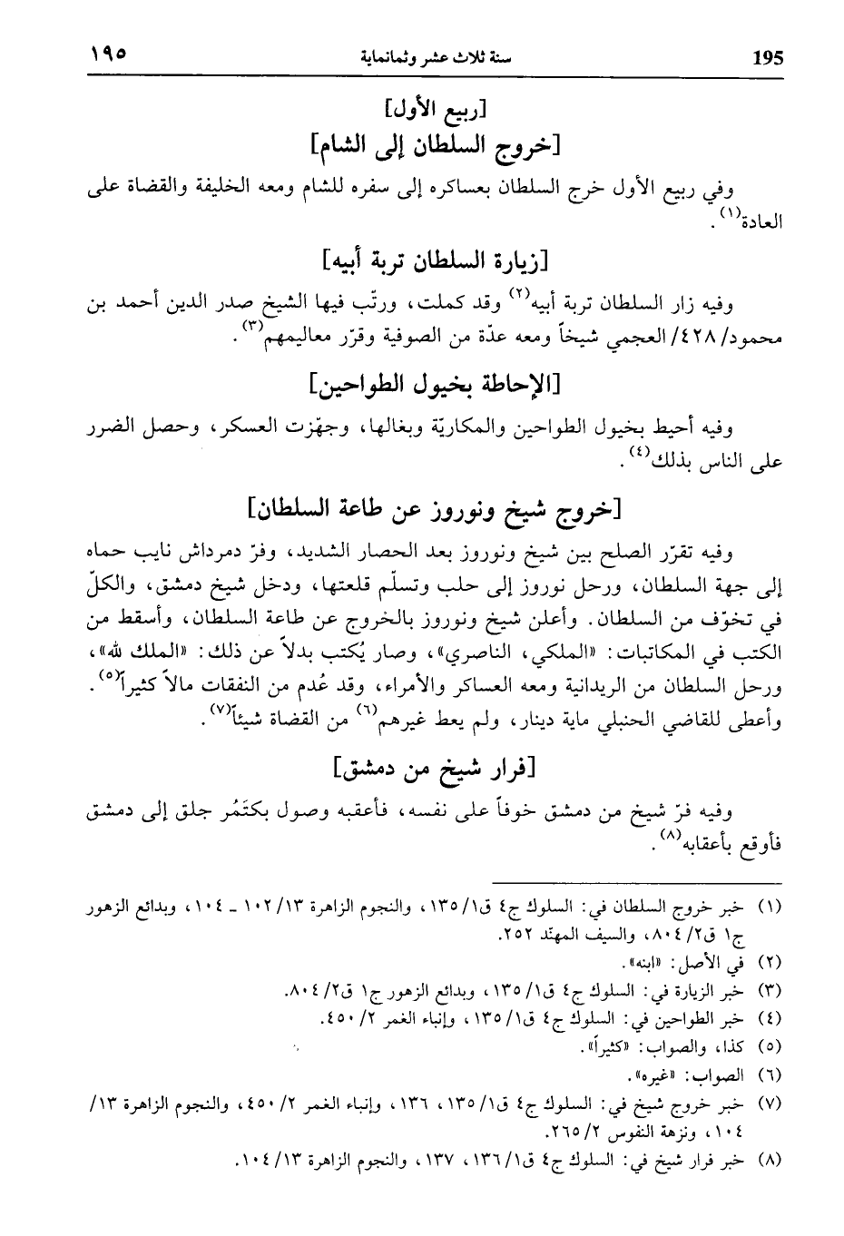 (¬1) خبر خروج السلطان في: السلوك ج 4 ق 1/ 135، والنجوم الزاهرة 13/ 102 - 104، وبدائع الزهور ج 1 ق 2/ 804، والسيف المهنّد 252.