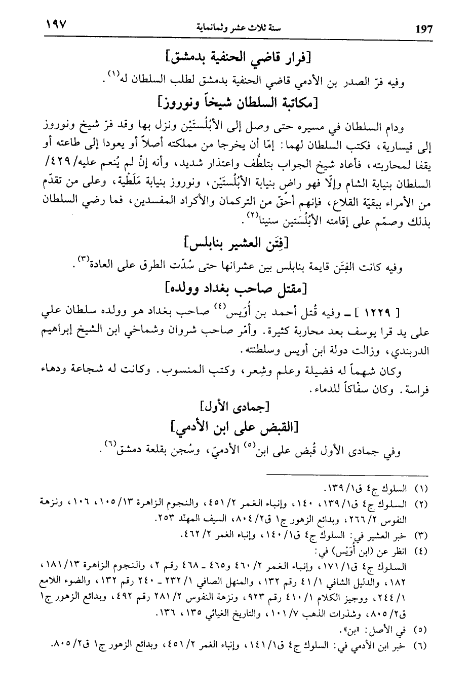 (¬4) انظر عن (ابن أويس) في: السلوك ج 4 ق 1/ 171، وإنباء الغمر 2/ 460 و 465 - 468 رقم 2، والنجوم الزاهرة 13/ 181، 182، والدليل الشافي 1/ 41 رقم 132، والمنهل الصافي 1/ 232 - 240 رقم 132، والضوء اللامع 1/ 244، ووجيز الكلام 1/ 410 رقم 923، ونزهة النفوس 2/ 281 رقم 492، وبدائع الزهور ج 1 ق 2/ 805، وشذرات الذهب 7/ 101، والتاريخ الغيائي 135، 136.