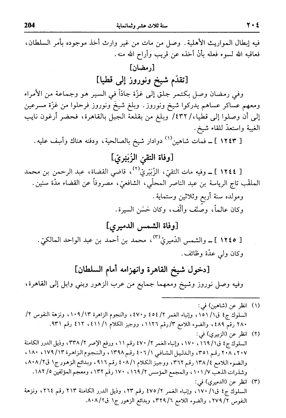 (¬3) انظر عن (الدميري) في: السلوك ج 4 ق 1/ 170، وإنباء الغمر 2/ 475 رقم 23، وذيل الدرر الكامنة 213 رقم 264، ونزهة النفوس 2/ 279، والضوء اللامع 6/ 329، وبدائع الزهور ج 1 ق 2/ 808.