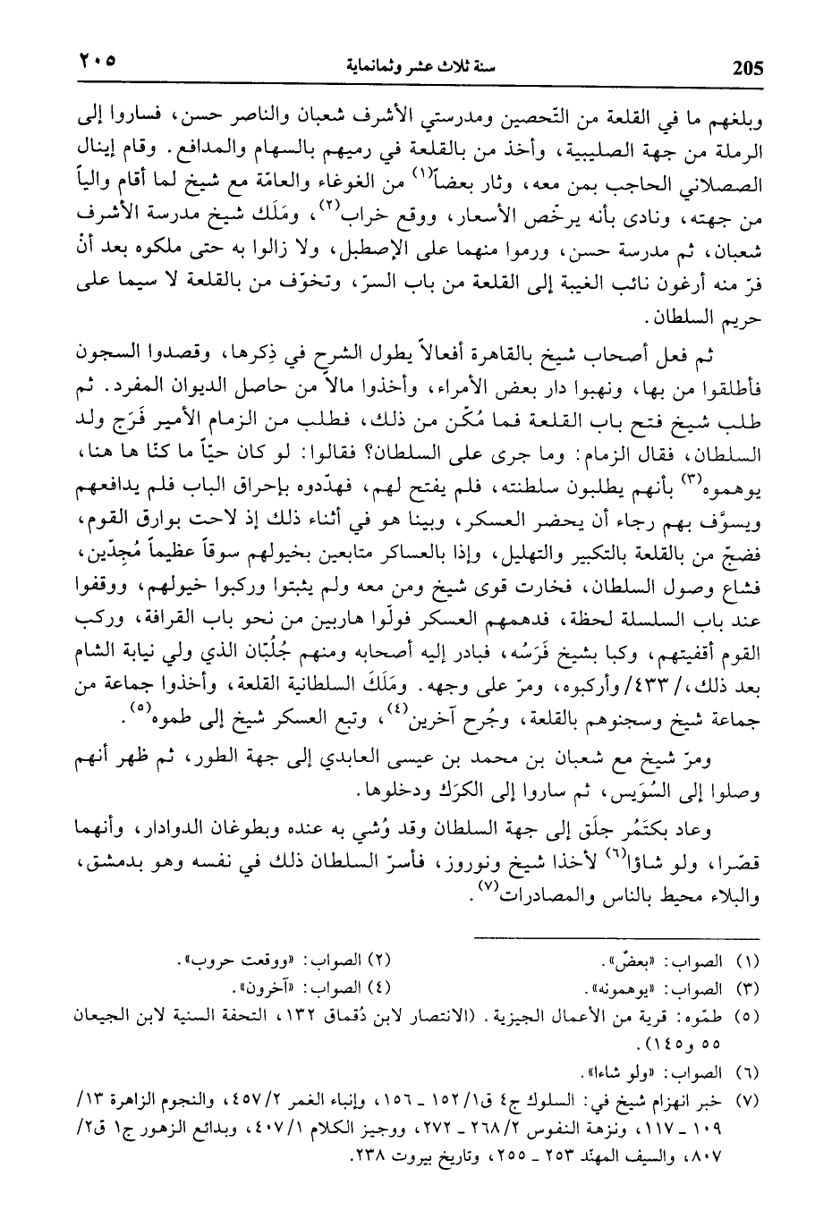 (¬7) خبر انهزام شيخ في: السلوك ج 4 ق 1/ 152 - 156، وإنباء الغمر 2/ 457، والنجوم الزاهرة 13/ 109 - 117، ونزهة النفوس 2/ 268 - 272، ووجيز الكلام 1/ 407، وبدائع الزهور ج 1 ق 2/ 807، والسيف المهنّد 253 - 255، وتاريخ بيروت 238.