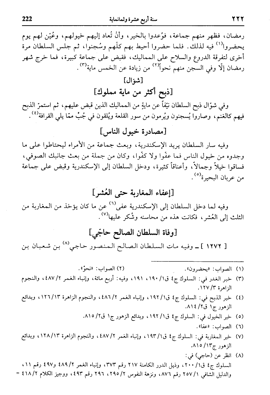 (¬7) خبر المغاربة في: السلوك ج 4 ق 1/ 193، وإنباء الغمر 2/ 487، والنجوم الزاهرة 13/ 128، وبدائع الزهور ج 13/ 815.