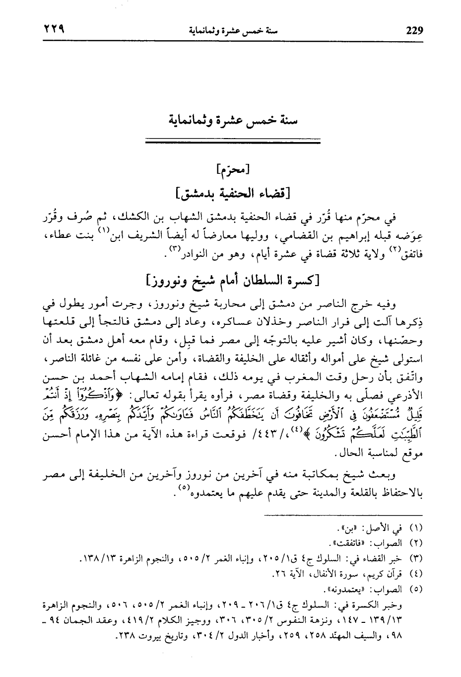 وفيه خرج الناصر من دمشق إلى محاربة شيخ ونوروز، وجرت أمور يطول في ذكرها آلت إلى فرار الناصر وخذلان عساكره، وعاد إلى دمشق فالتجأ إلى قلعتها وحصّنها، وكان أشير عليه بالتوجّه إلى مصر فما قبل، وقام معه أهل دمشق بعد أن استولى شيخ على أمواله وأثقاله على الخليفة والقضاة، وأمن على نفسه من غائلة الناصر، واتّفق بأن رحل وقت المغرب في يومه ذلك، فقام إمامه الشهاب أحمد بن حسن الأذرعي فصلّى به والخليفة وقضاة مصر، فرأوه يقرأ بقوله تعالى: {وَاُذْكُرُوا إِذْ أَنْتُمْ قَلِيلٌ مُسْتَضْعَفُونَ فِي الْأَرْضِ تَخافُونَ أَنْ يَتَخَطَّفَكُمُ النّاسُ فَآواكُمْ وَأَيَّدَكُمْ بِنَصْرِهِ وَرَزَقَكُمْ مِنَ الطَّيِّباتِ لَعَلَّكُمْ تَشْكُرُونَ} (¬4)، / 443 / فوقعت قراءة هذه الآية من هذا الإمام أحسن موقع لمناسبة الحال.
