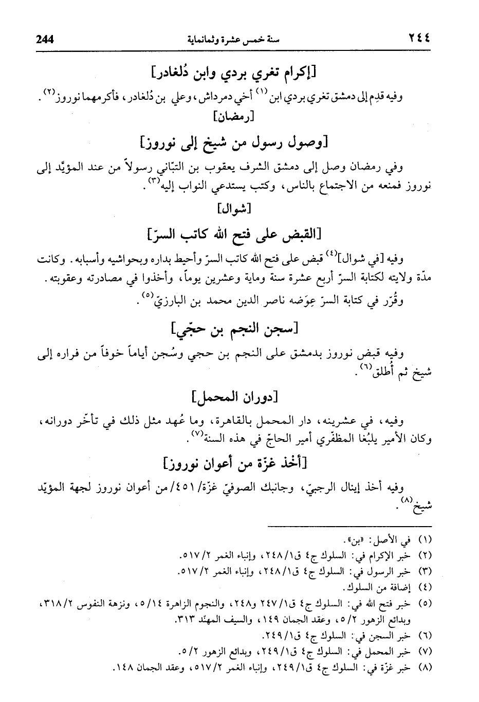 (¬5) خبر فتح الله في: السلوك ج 4 ق 1/ 247 و 248، والنجوم الزاهرة 14/ 5، ونزهة النفوس 2/ 318، وبدائع الزهور 2/ 5، وعقد الجمان 149، والسيف المهنّد 313.