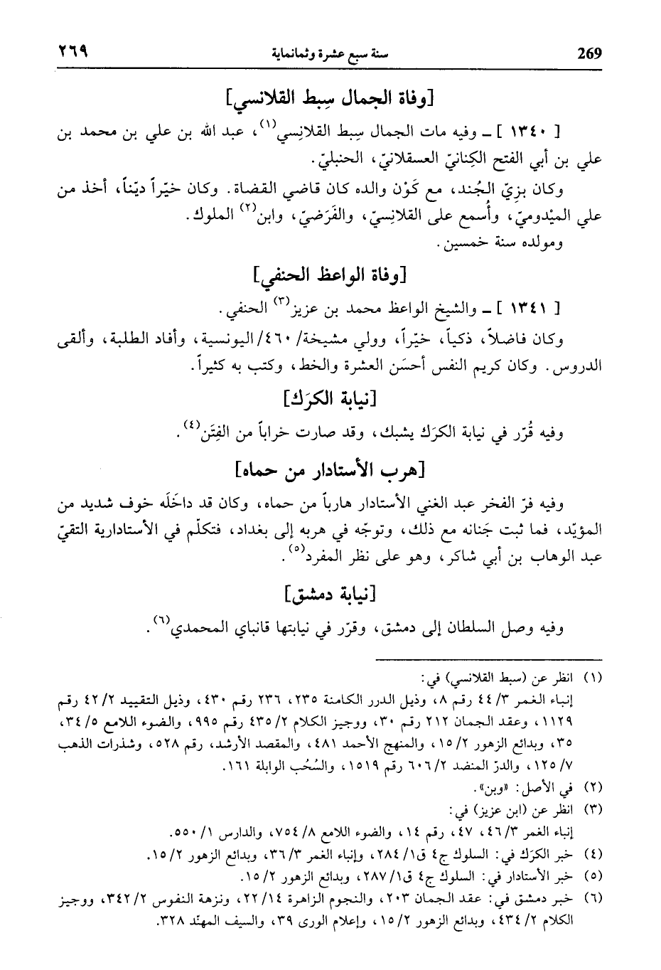 (¬6) خبر دمشق في: عقد الجمان 203، والنجوم الزاهرة 14/ 22، ونزهة النفوس 2/ 342، ووجيز الكلام 2/ 434، وبدائع الزهور 2/ 15، وإعلام الورى 39، والسيف المهنّد 328.