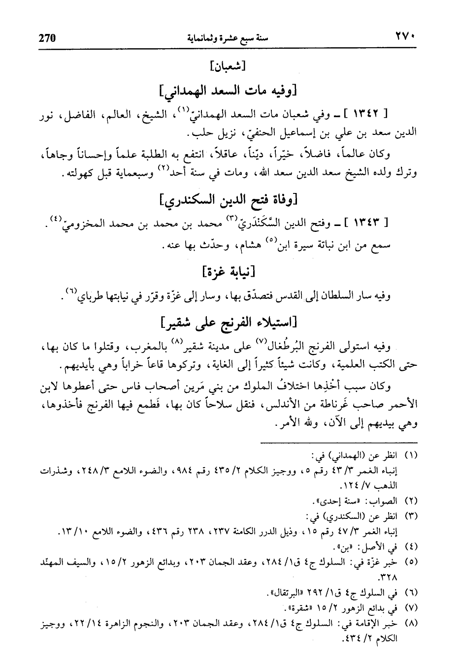 [1342]- وفي شعبان مات السعد الهمدانيّ (¬1)، الشيخ، العالم، الفاضل، نور الدين سعد بن علي بن إسماعيل الحنفيّ، نزيل حلب.