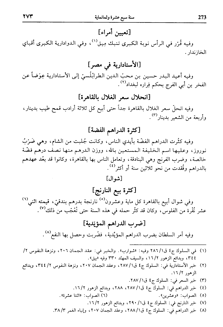 وفيه أعيد البدر حسين بن محبّ الدين الطرابلسيّ إلى الأستادارية عوضا عن الفخر بن أبي الفرج بحكم فراره لبغداد (¬2).