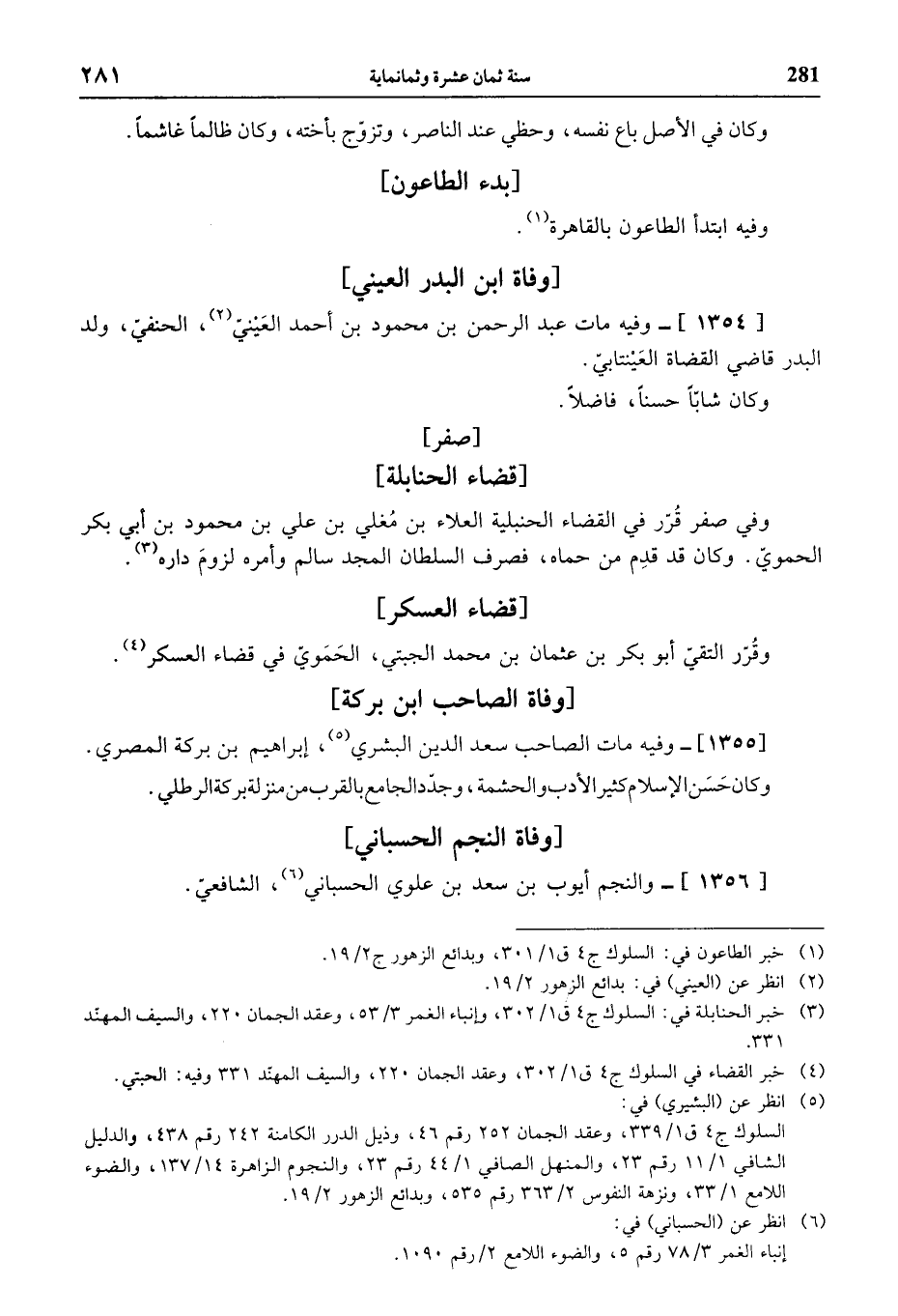 (¬5) انظر عن (البشيري) في: السلوك ج 4 ق 1/ 339، وعقد الجمان 252 رقم 46، وذيل الدرر الكامنة 242 رقم 438، والدليل الشافي 1/ 11 رقم 23، والمنهل الصافي 1/ 44 رقم 23، والنجوم الزاهرة 14/ 137، والضوء اللامع 1/ 33، ونزهة النفوس 2/ 363 رقم 535، وبدائع الزهور 2/ 19.