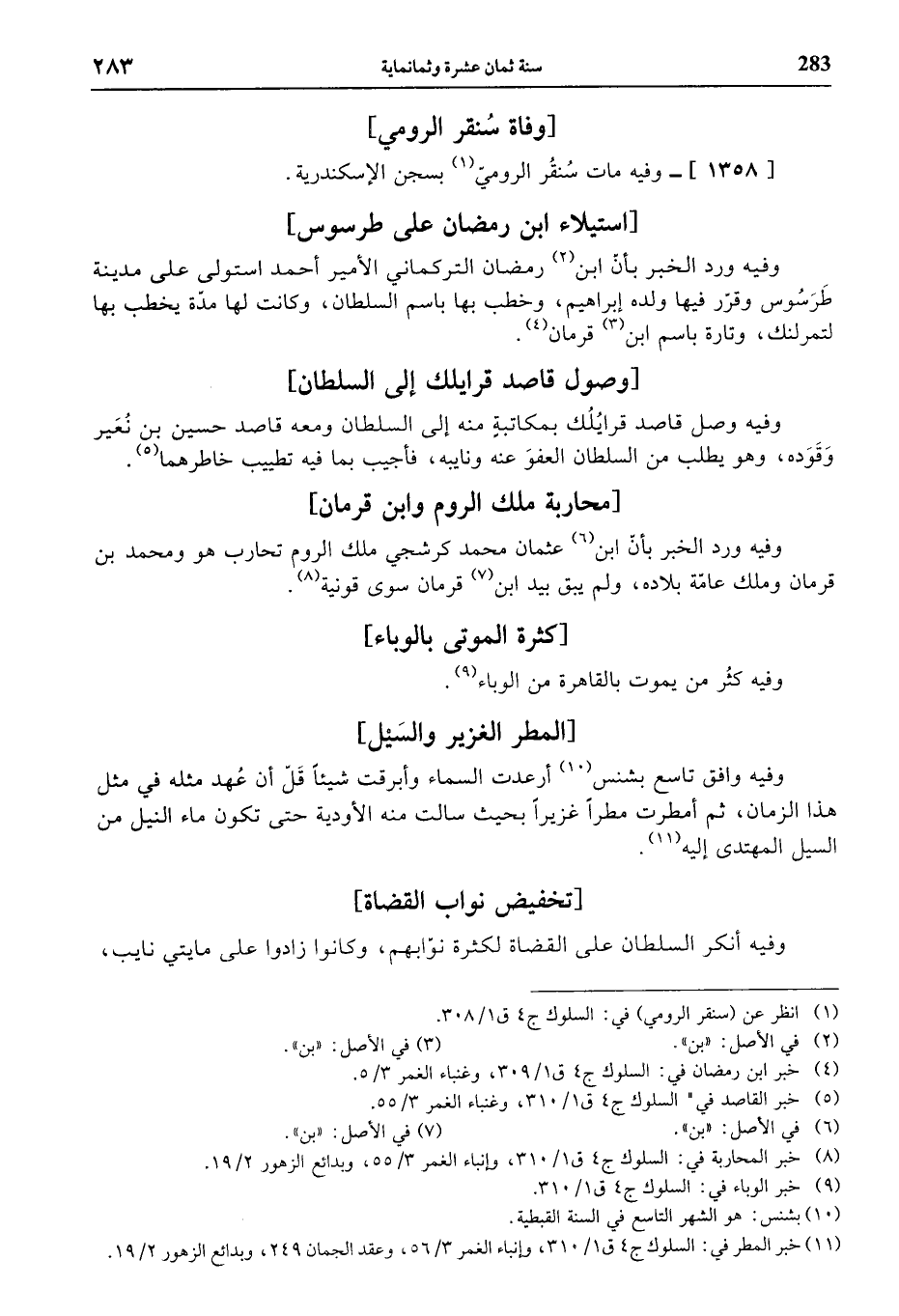 (¬11) خبر المطر في: السلوك ج 4 ق 1/ 310، وإنباء الغمر 3/ 56، وعقد الجمان 249، وبدائع الزهور 2/ 19.
