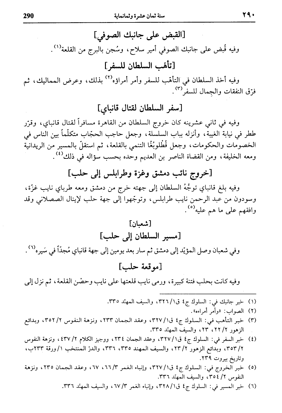 وفيه بلغ قانباي توجّه السلطان إلى جهته خرج من دمشق ومعه طرباي نايب غزّة، وسودون من عبد الرحمن نايب طرابلس، وتوجّهوا إلى جهة حلب لإينال الصصلاني وقد وافقهم على ما هم عليه (¬5).
