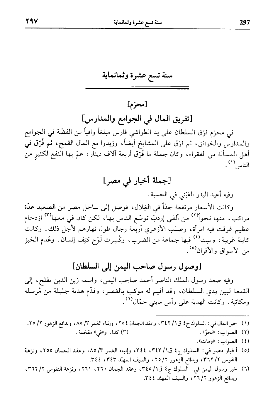 (¬6) خبر رسول اليمن في: السلوك ج 4 ق 1/ 345، وعقد الجمان 260، 261، ونزهة النفوس 2/ 362، وبدائع الزهور 2/ 26، والسيف المهنّد 344.