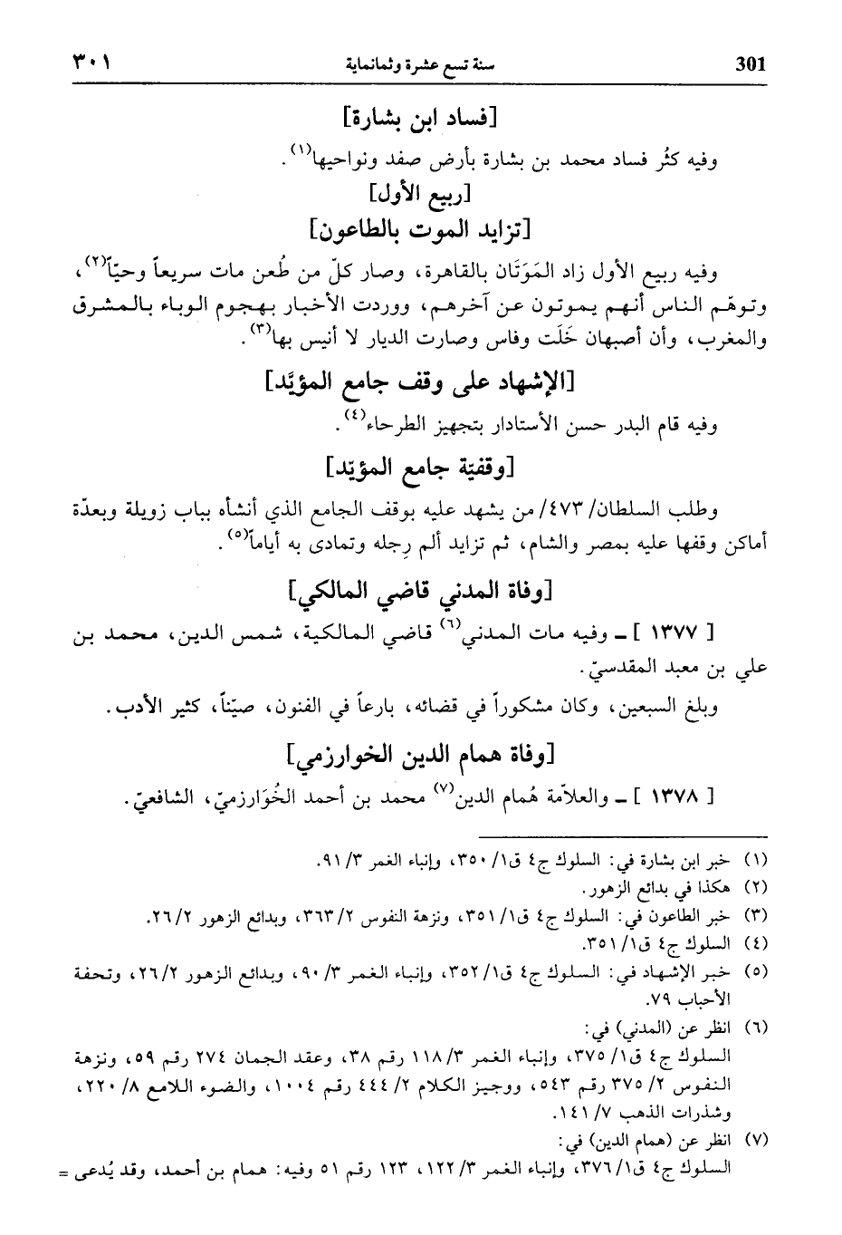 (¬6) انظر عن (المدني) في: السلوك ج 4 ق 1/ 375، وإنباء الغمر 3/ 118 رقم 38، وعقد الجمان 274 رقم 59، ونزهة النفوس 2/ 375 رقم 543، ووجيز الكلام 2/ 444 رقم 1004، والضوء اللامع 8/ 220، وشذرات الذهب 7/ 141.