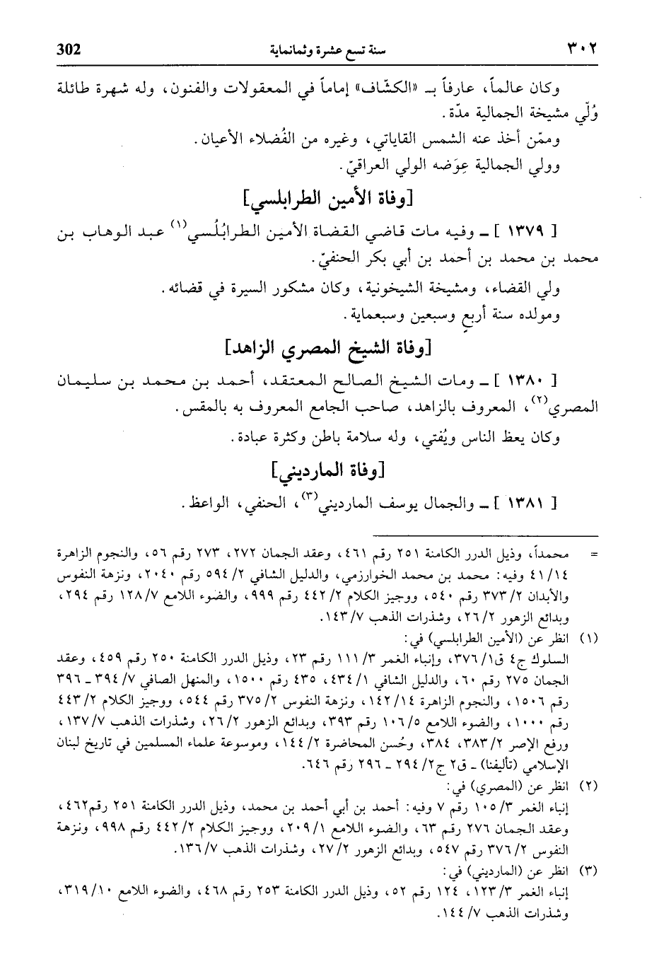 (¬3) انظر عن (المارديني) في: إنباء الغمر 3/ 123، 124 رقم 52، وذيل الدرر الكامنة 253 رقم 468، والضوء اللامع 10/ 319، وشذرات الذهب 7/ 144.