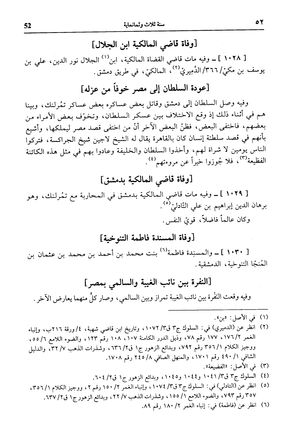 (¬2) انظر عن (الدميري) في: السلوك ج 3 ق 3/ 1072، وتاريخ ابن قاضي شهبة، 4 / ورقة 216 ب، وإنباء الغمر 2/ 176، 177 رقم 78، وذيل الدرر الكامنة 107، 108 رقم 123، والضوء اللامع 6/ 55، ووجيز الكلام 1/ 356 رقم 792، وبدائع الزهور ج 1 ق 2/ 636، وشذرات الذهب 7/ 32، والدليل الشافي 1/ 490 رقم 1701، والمنهل الصافي 8/ 245 رقم 1708.