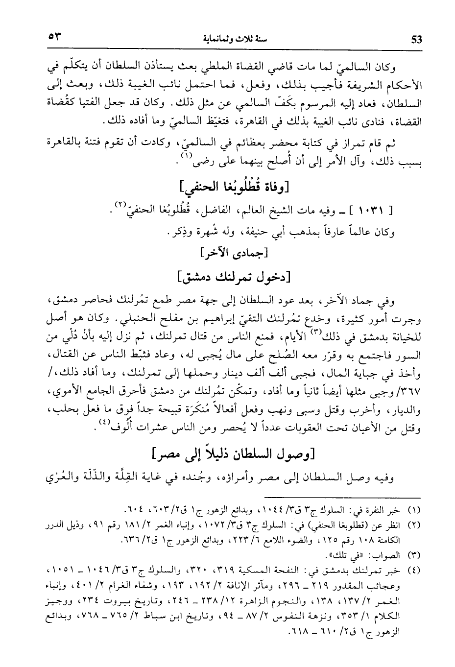 (¬4) خبر تمرلنك بدمشق في: النفحة المسكية 319، 320، والسلوك ج 3 ق 3/ 1046 - 1051، وعجائب المقدور 219 - 296، ومآثر الإنافة 2/ 192، 193، وشفاء الغرام 2/ 401، وإنباء الغمر 2/ 137، 138، والنجوم الزاهرة 12/ 238 - 246، وتاريخ بيروت 234، ووجيز الكلام 1/ 353، ونزهة النفوس 2/ 87 - 94، وتاريخ ابن سباط 2/ 765 - 768، وبدائع الزهور ج 1 ق 2/ 610 - 618.