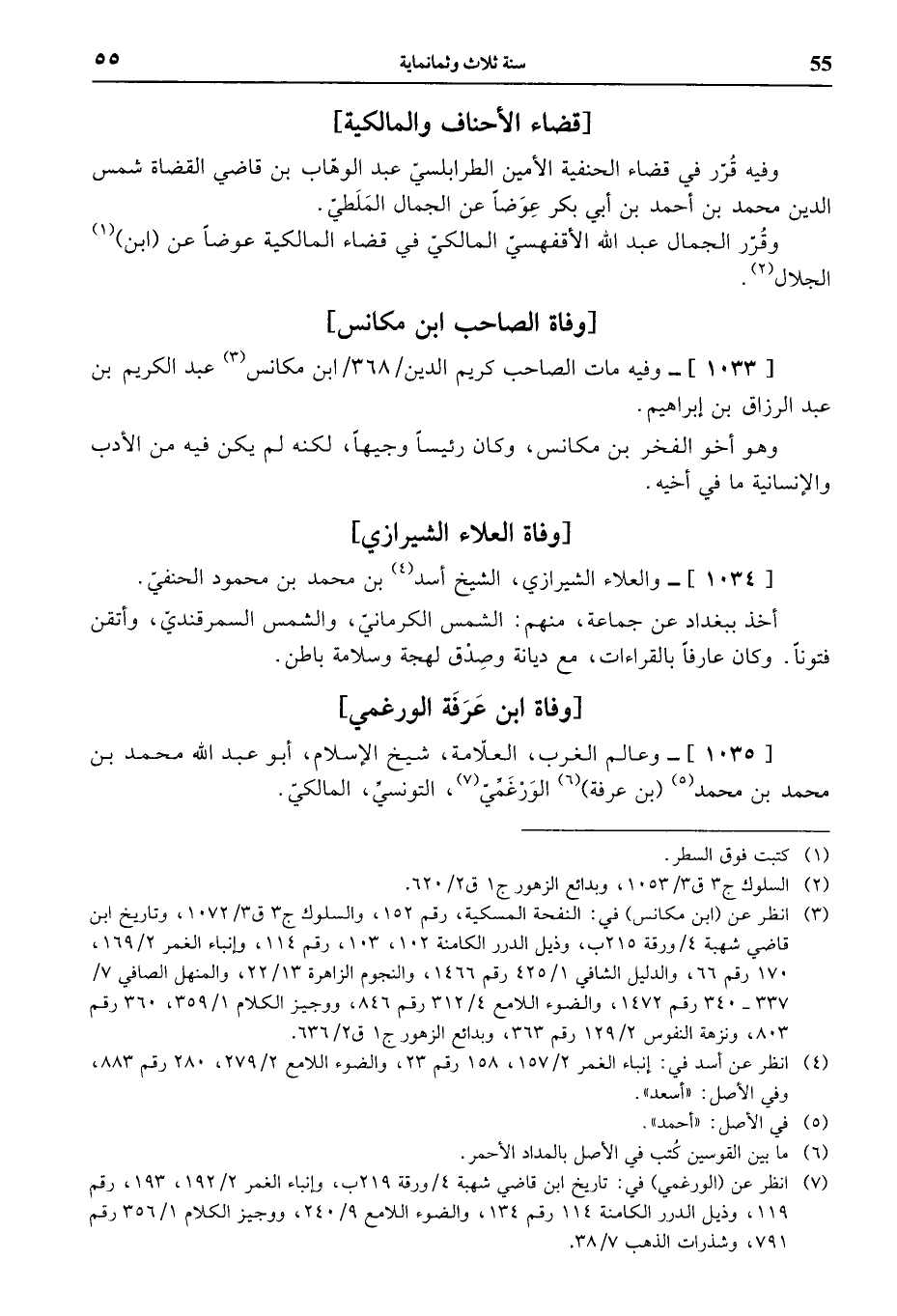 (¬3) انظر عن (ابن مكانس) في: النفحة المسكية، رقم 152، والسلوك ج 3 ق 3/ 1072، وتاريخ ابن قاضي شهبة 4 / ورقة 215 ب، وذيل الدرر الكامنة 102، 103، رقم 114، وإنباء الغمر 2/ 169، 170 رقم 66، والدليل الشافي 1/ 425 رقم 1466، والنجوم الزاهرة 13/ 22، والمنهل الصافي 7/ 337 - 340 رقم 1472، والضوء اللامع 4/ 312 رقم 846، ووجيز الكلام 1/ 359، 360 رقم 803، ونزهة النفوس 2/ 129 رقم 363، وبدائع الزهور ج 1 ق 2/ 636.