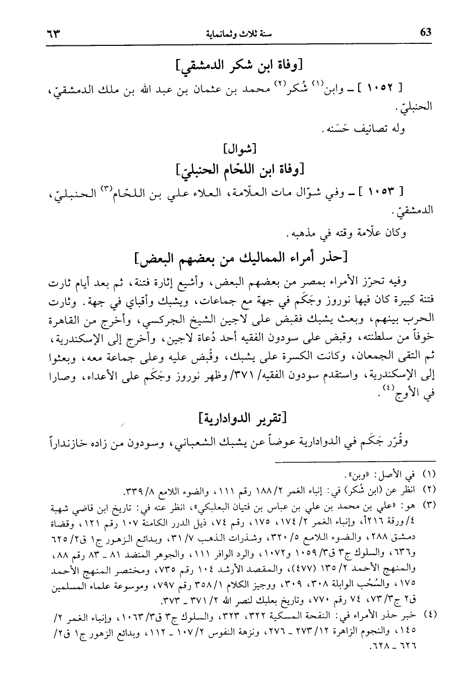 (¬3) هو: «علي بن محمد بن علي بن عباس بن فتيان البعلبكي»، انظر عنه في: تاريخ ابن قاضي شهبة 4 / ورقة 216 أ، وإنباء الغمر 2/ 174، 175، رقم 74، ذيل الدرر الكامنة 107 رقم 121، وقضاة دمشق 288، والضوء اللامع 5/ 320، وشذرات الذهب 7/ 31، وبدائع الزهور ج 1 ق 2/ 625 و 636، والسلوك ج 3 ق 3/ 1059 و 1072، والرد الوافر 111، والجوهر المنضد 81 - 83 رقم 88، والمنهج الأحمد 2/ 135 (477)، والمقصد الأرشد 104 رقم 735، ومختصر المنهج الأحمد 175، والسحب الوابلة 308، 309، ووجيز الكلام 1/ 358 رقم 797، وموسوعة علماء المسلمين ق 2 ج 3/ 73، 74 رقم 770، وتاريخ بعلبك لنصر الله 2/ 371 - 373.