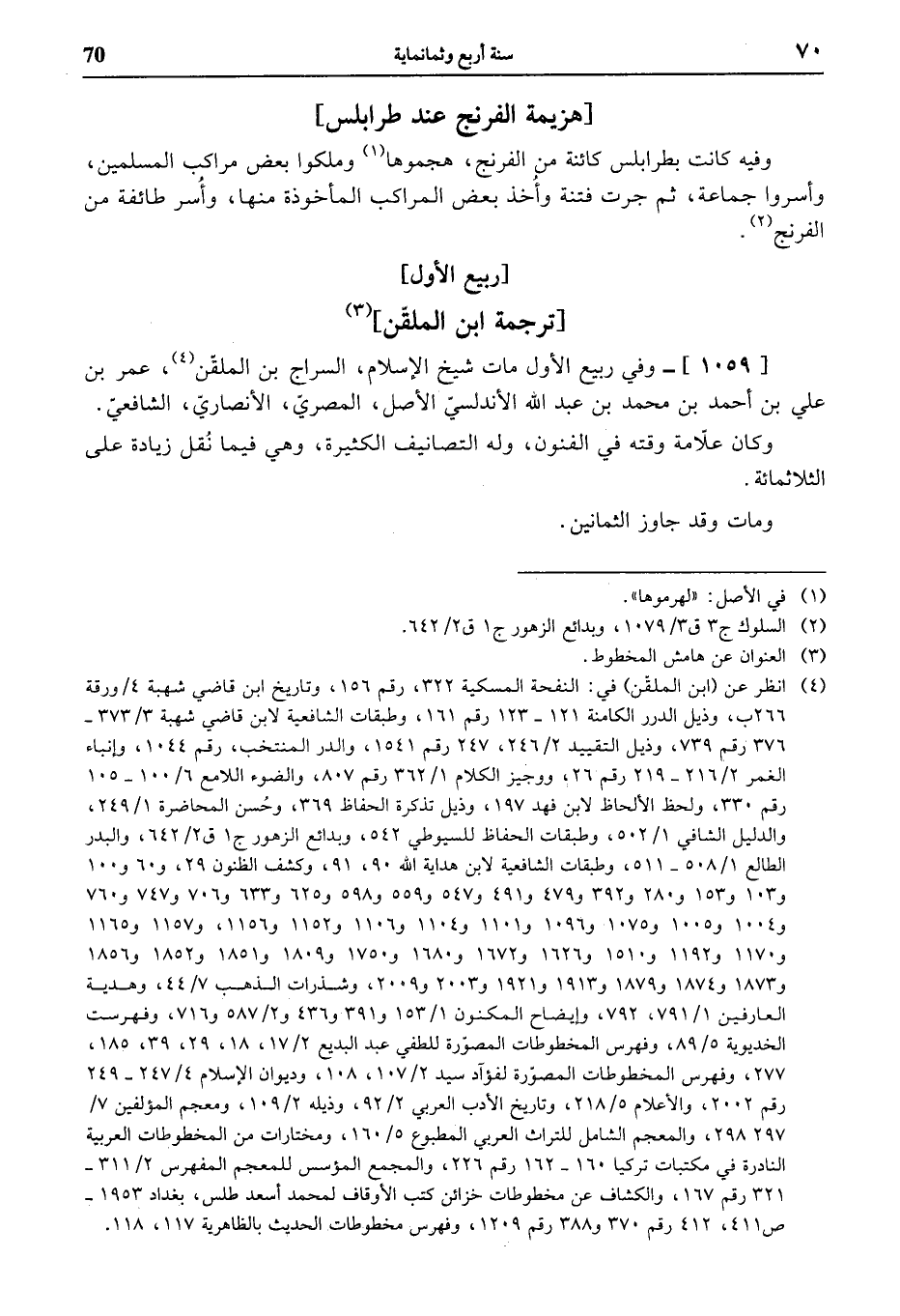 (¬4) انظر عن (ابن الملقّن) في: النفحة المسكية 322، رقم 156، وتاريخ ابن قاضي شهبة 4 / ورقة 266 ب، وذيل الدرر الكامنة 121 - 123 رقم 161، وطبقات الشافعية لابن قاضي شهبة 3/ 373 - 376 رقم 739، وذيل التقييد 2/ 246، 247 رقم 1541، والدر المنتخب، رقم 1044، وإنباء الغمر 2/ 216 - 219 رقم 26، ووجيز الكلام 1/ 362 رقم 807، والضوء اللامع 6/ 100 - 105 رقم 330، ولحظ الألحاظ لابن فهد 197، وذيل تذكرة الحفاظ 369، وحسن المحاضرة 1/ 249، والدليل الشافي 1/ 502، وطبقات الحفاظ للسيوطي 542، وبدائع الزهور ج 1 ق 2/ 642، والبدر الطالع 1/ 508 - 511، وطبقات الشافعية لابن هداية الله 90، 91، وكشف الظنون 29، و 60 و 100 و 103 و 153 و 280 و 392 و 479 و 491 و 547 و 559 و 598 و 625 و 633 و 706 و 747 و 760 و 1004 و 1005 و 1075 و 1096 و 1101 و 1104 و 1106 و 1152 و 1156، و 1157 و 1165 و 1170 و 1192 و 1510 و 1626 و 1672 و 1680 و 1750 و 1809 و 1851 و 1852 و 1856 و 1873 و 1874 و 1879 و 1913 و 1921 و 2003 و 2009، وشذرات الذهب 7/ 44، وهدية العارفين 1/ 791، 792، وإيضاح المكنون 1/ 153 و 391 و 436 و 2/ 587 و 716، وفهرست الخديوية 5/ 89، وفهرس المخطوطات المصوّرة للطفي عبد البديع 2/ 17، 18، 29، 39، 185، 277، وفهرس المخطوطات المصوّرة لفؤآد سيد 2/ 107، 108، وديوان الإسلام 4/ 247 - 249 رقم 2002، والأعلام 5/ 218، وتاريخ الأدب العربي 2/ 92، وذيله 2/ 109، ومعجم المؤلفين 7/ 297 - 298، والمعجم الشامل للتراث العربي المطبوع 5/ 160، ومختارات من المخطوطات العربية النادرة في مكتبات تركيا 160 - 162 رقم 226، والمجمع المؤسس للمعجم المفهرس 2/ 311 - 321 رقم 167، والكشاف عن مخطوطات خزائن كتب الأوقاف لمحمد أسعد طلس، بغداد 1953 - ص 411، 412 رقم 370 و 388 رقم 1209، وفهرس مخطوطات الحديث بالظاهرية 117، 118.