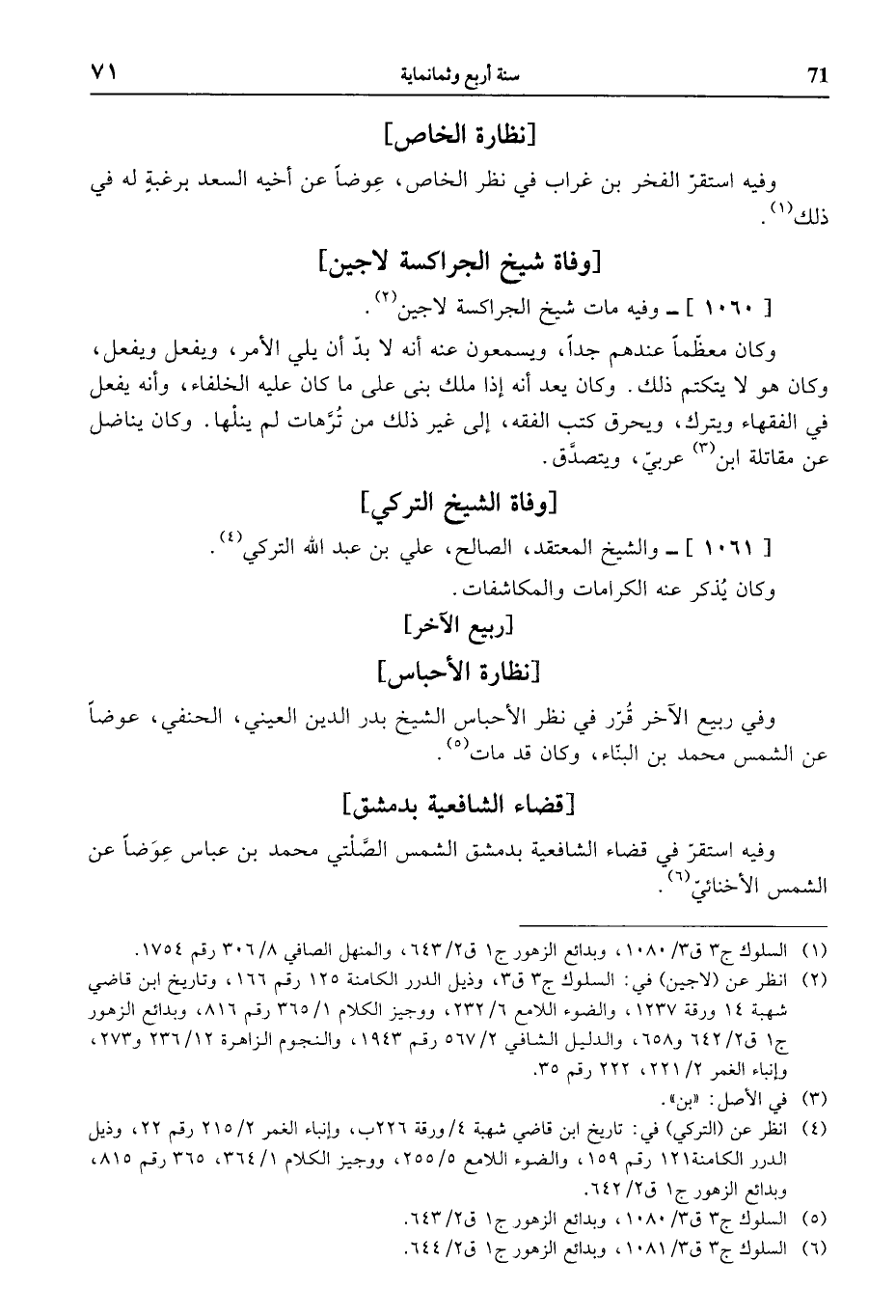 (¬4) انظر عن (التركي) في: تاريخ ابن قاضي شهبة 4 / ورقة 226 ب، وإنباء الغمر 2/ 215 رقم 22، وذيل الدرر الكامنة 121 رقم 159، والضوء اللامع 5/ 255، ووجيز الكلام 1/ 364، 365 رقم 815، وبدائع الزهور ج 1 ق 2/ 642.