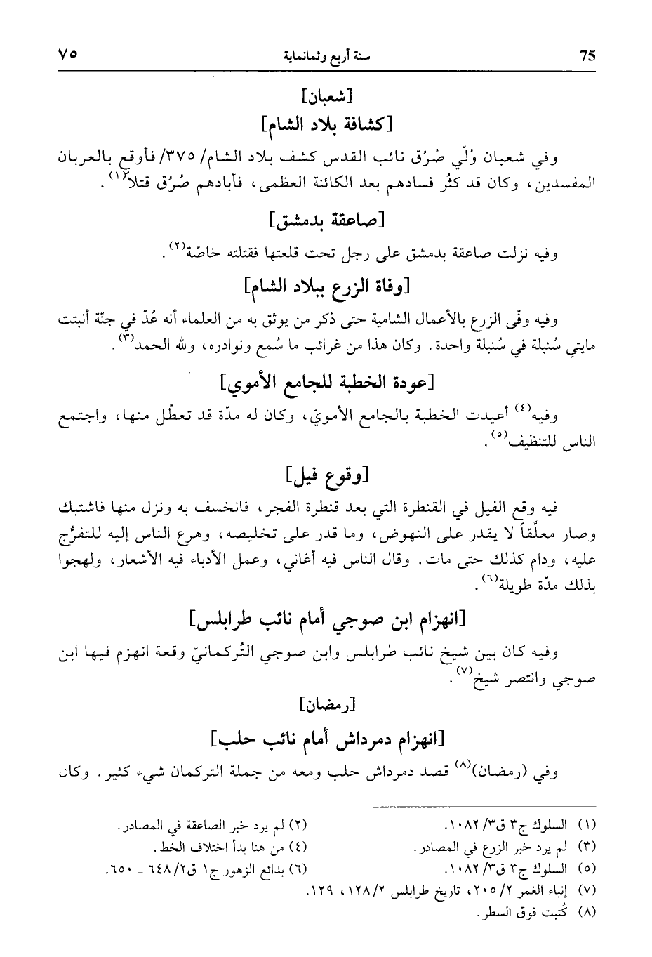 وفي شعبان ولّي صرق نائب القدس كشف بلاد الشام / 375 / فأوقع بالعربان المفسدين، وكان قد كثر فسادهم بعد الكائنة العظمى، فأبادهم صرق قتلا (¬1).