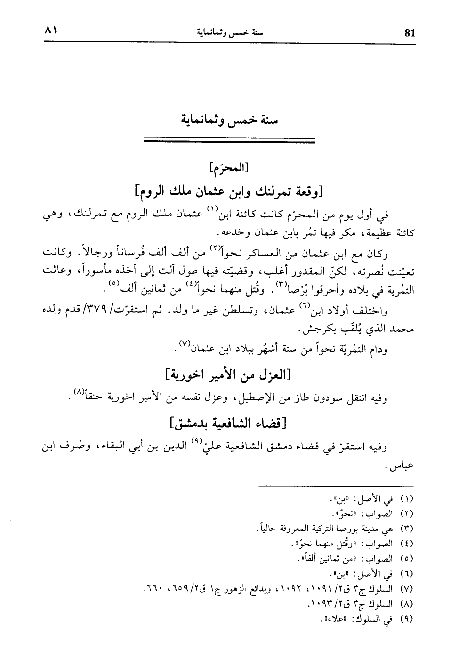 في أول يوم من المحرّم كانت كائنة ابن (¬1) عثمان ملك الروم مع تمرلنك، وهي كائنة عظيمة، مكر فيها تمر بابن عثمان وخدعه.