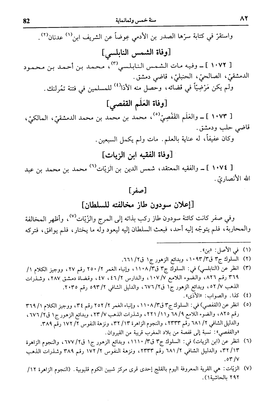 (¬3) انظر عن (النابلسي) في: السلوك ج 3 ق 3/ 1108، وإنباء الغمر 2/ 250 رقم 27، ووجيز الكلام 1/ 369 رقم 826، والضوء اللامع 7/ 107، والدارس 2/ 46، 47، وقضاة دمشق 287، وشذرات الذهب 7/ 52، وبدائع الزهور ج 1 ق 2/ 676، والدليل الشافي 2/ 593 رقم 2035.