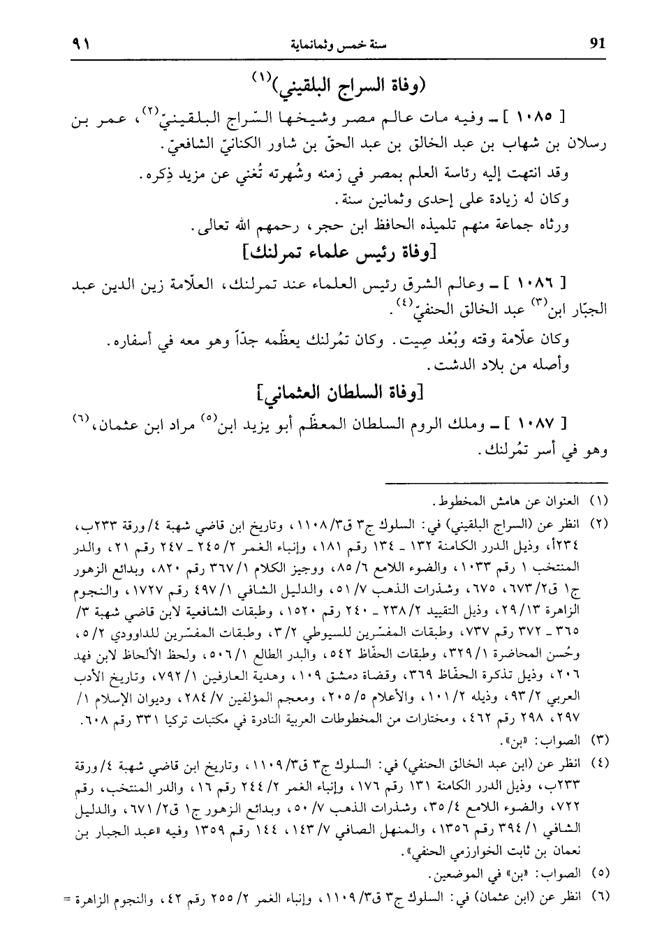 (¬2) انظر عن (السراج البلقيني) في: السلوك ج 3 ق 3/ 1108، وتاريخ ابن قاضي شهبة 4 / ورقة 233 ب، 234 أ، وذيل الدرر الكامنة 132 - 134 رقم 181، وإنباء الغمر 2/ 245 - 247 رقم 21، والدر المنتخب 1 رقم 1033، والضوء اللامع 6/ 85، ووجيز الكلام 1/ 367 رقم 820، وبدائع الزهور ج 1 ق 2/ 673، 675، وشذرات الذهب 7/ 51، والدليل الشافي 1/ 497 رقم 1727، والنجوم الزاهرة 13/ 29، وذيل التقييد 2/ 238 - 240 رقم 1520، وطبقات الشافعية لابن قاضي شهبة 3/ 365 - 372 رقم 737، وطبقات المفسّرين للسيوطي 2/ 3، وطبقات المفسّرين للداوودي 2/ 5، وحسن المحاضرة 1/ 329، وطبقات الحفّاظ 542، والبدر الطالع 1/ 506، ولحظ الألحاظ لابن فهد 206، وذيل تذكرة الحفّاظ 369، وقضاة دمشق 109، وهدية العارفين 1/ 792، وتاريخ الأدب العربي 2/ 93، وذيله 2/ 101، والأعلام 5/ 205، ومعجم المؤلفين 7/ 284، وديوان الإسلام 1/ 297، 298 رقم 462، ومختارات من المخطوطات العربية النادرة في مكتبات تركيا 331 رقم 608.