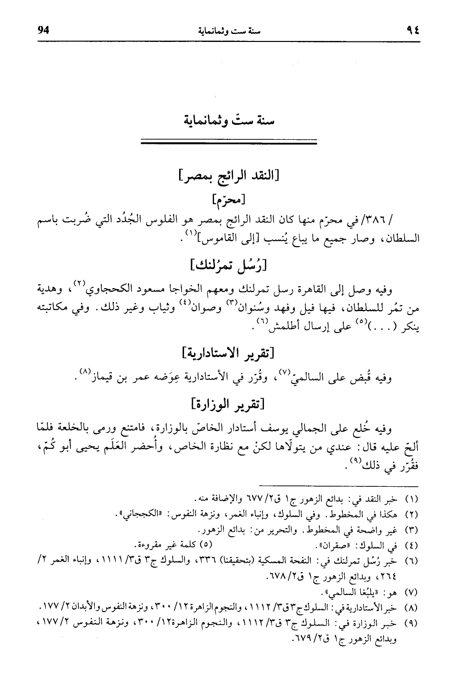 / 386 / في محرّم منها كان النقد الرائج بمصر هو الفلوس الجدد التي ضربت باسم السلطان، وصار جميع ما يباع ينسب [إلى القاموس] (¬1).