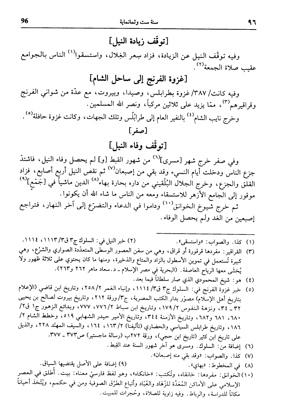 (¬5) خبر غزوة الفرنج في: السلوك ج 3 ق 3/ 1114، وإنباء الغمر 2/ 258، وتاريخ ابن قاضي (الإعلام بتاريخ أهل الإسلام) مصوّر بدار الكتب المصرية، ج 3 / ورقة 212، وتاريخ بيروت لصالح بن يحيى 32 - 34، ونزهة النفوس 2/ 179، وتاريخ ابن سباط 2/ 776، 777، وبدائع الزهور ج 1 ق 2/ 680، 681 و 682، وتاريخ الأزمنة 344، وتاريخ الأمير حيدر الشهابي 519، وخطط الشام 2/ 186، وتاريخ طرابلس السياسي والحضاري (تأليفنا) 2/ 163، 164، والسيف المهنّد 228، والذيل على تاريخ ابن كثير (تاريخ ابن حجي)، ورقة 272 ب (رسالة ماجستير) ص 373 - 377.