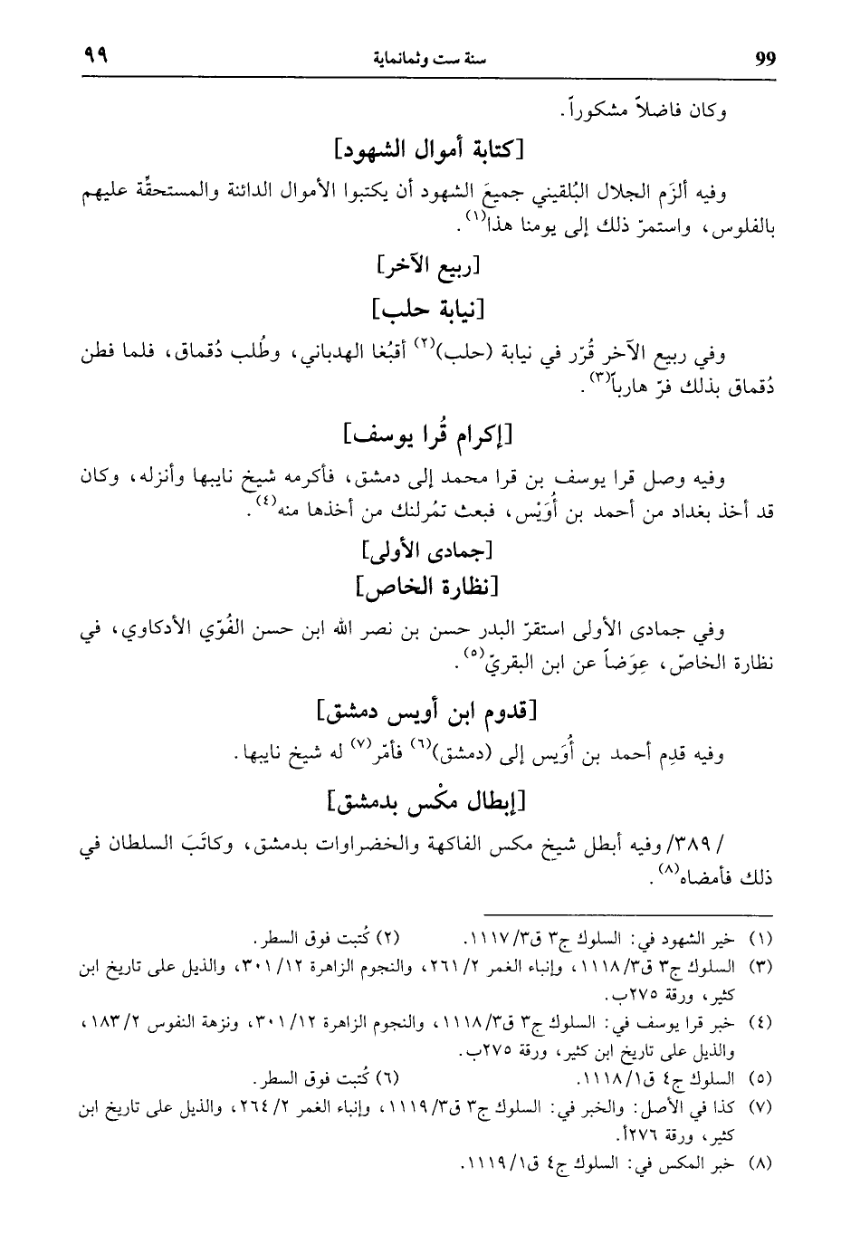 / 389 / وفيه أبطل شيخ مكس الفاكهة والخضراوات بدمشق، وكاتب السلطان في ذلك فأمضاه (¬8).