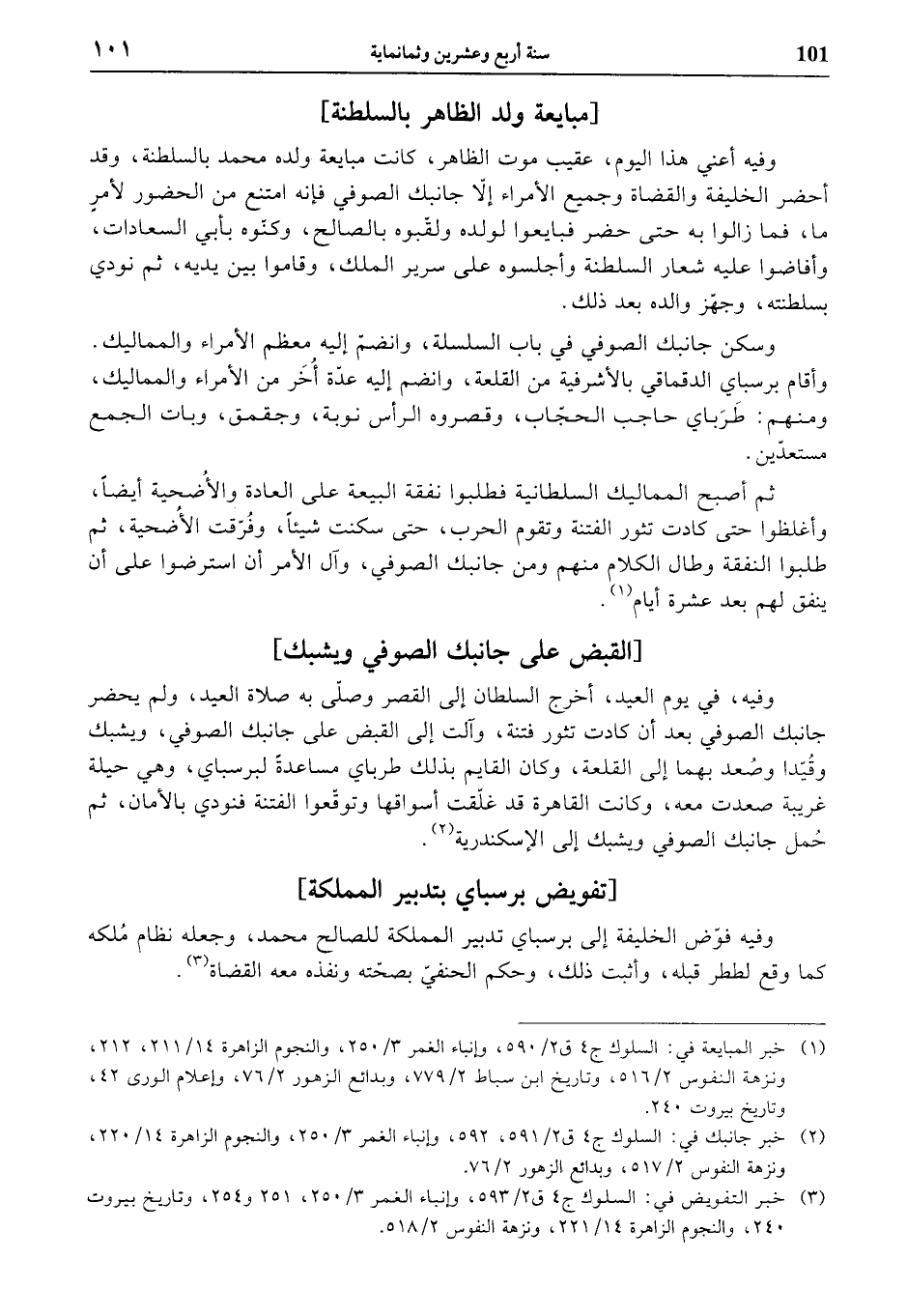 (¬1) خبر المبايعة في: السلوك ج 4 ق 2/ 590، وإنباء الغمر 3/ 250، والنجوم الزاهرة 14/ 211، 212، ونزهة النفوس 2/ 516، وتاريخ ابن سباط 2/ 779، وبدائع الزهور 2/ 76، وإعلام الورى 42، وتاريخ بيروت 240.