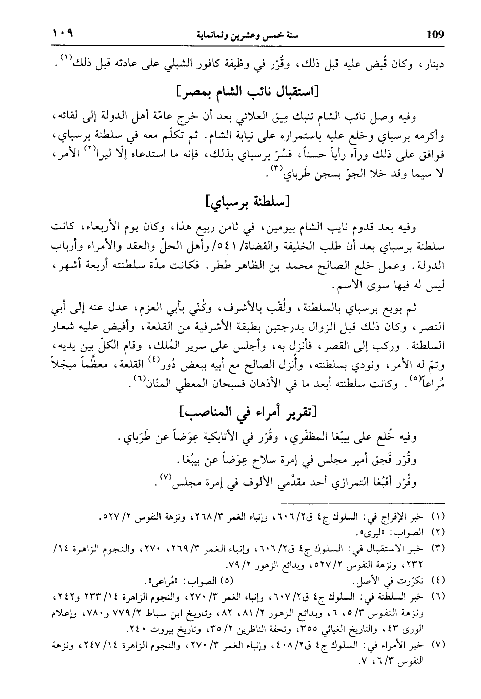 (¬6) خبر السلطنة في: السلوك ج 4 ق 2/ 607، وإنباء الغمر 3/ 270، والنجوم الزاهرة 14/ 233 و 242، ونزهة النفوس 3/ 5، 6، وبدائع الزهور 2/ 81، 82، وتاريخ ابن سباط 2/ 779 و 780، وإعلام الورى 43، والتاريخ الغياثي 355، وتحفة الناظرين 2/ 35، وتاريخ بيروت 240.