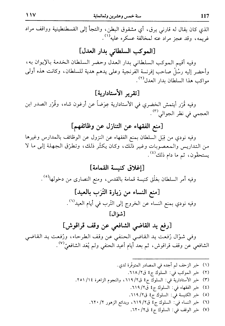 (¬6) خبر النساء في: السلوك ج 4 ق 2/ 619، وبدائع الزهور 2/ 620.