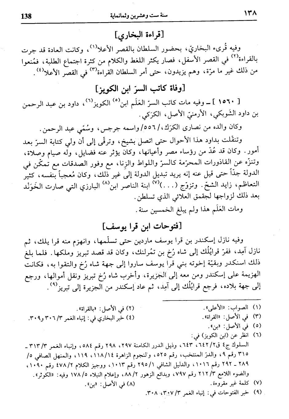 (¬6) انظر عن (ابن الكويز) في: السلوك ج 4 ق 2/ 642، 643، وذيل الدرر الكامنة 297، 298 رقم 584، وإنباء الغمر 3/ 313 - 315 رقم 9، والدرّ المنتخب، رقم 525، ولنجوم الزاهرة 14/ 118، 119، والمنهل الصافي 5/ 289 - 292 رقم 1016، والدليل الشافي 1/ 295 رقم 1013، ووجيز الكلام 2/ 478 رقم 1090، والضوء اللامع 3/ 212 رقم 797، وبدائع الزهور 2/ 88، وإعلام النبلاء 5/ 178 وفيه: «الكوثر».