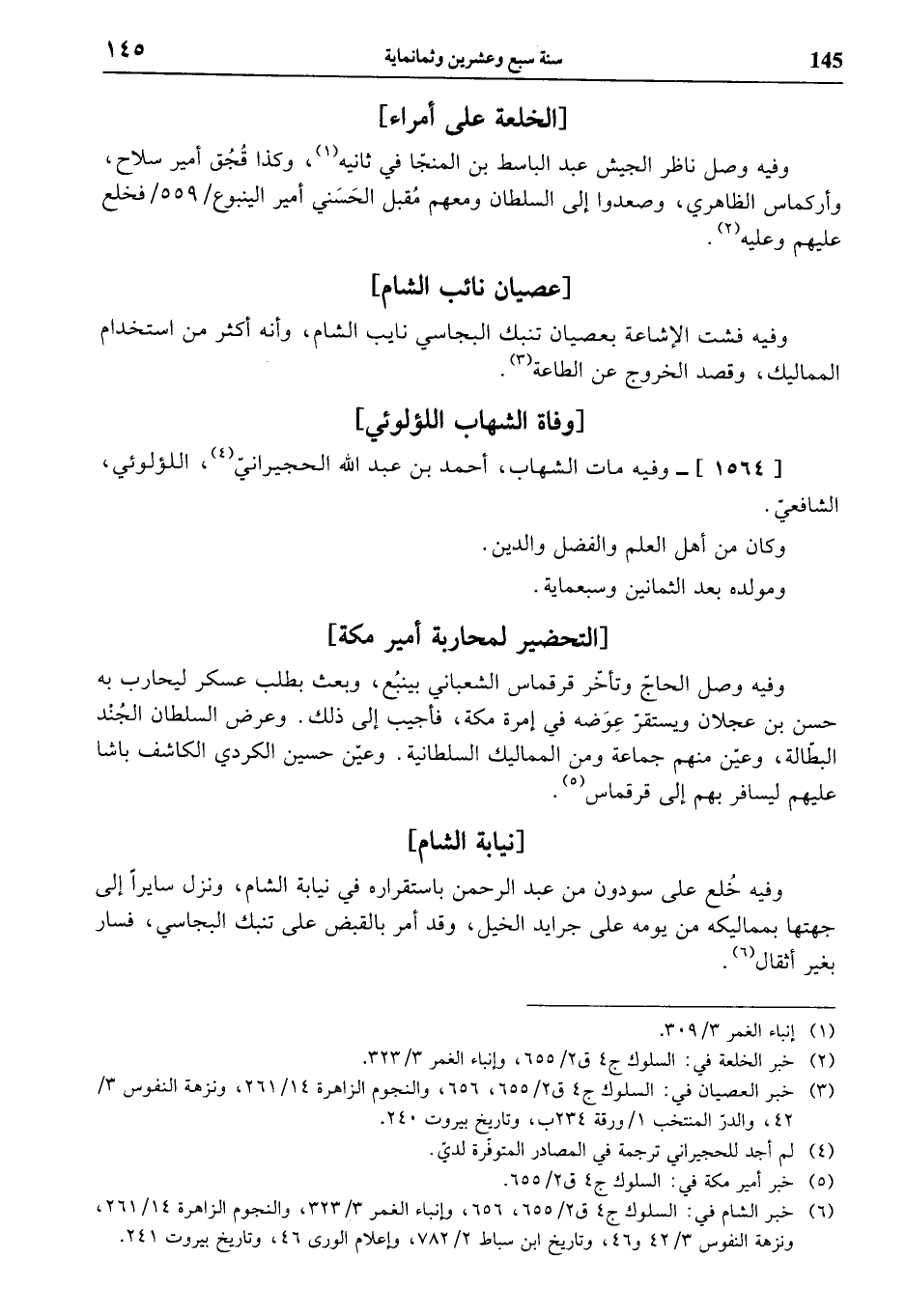 (¬6) خبر الشام في: السلوك ج 4 ق 2/ 655، 656، وإنباء الغمر 3/ 323، والنجوم الزاهرة 14/ 261، ونزهة النفوس 3/ 42 و 46، وتاريخ ابن سباط 2/ 782، وإعلام الورى 46، وتاريخ بيروت 241.