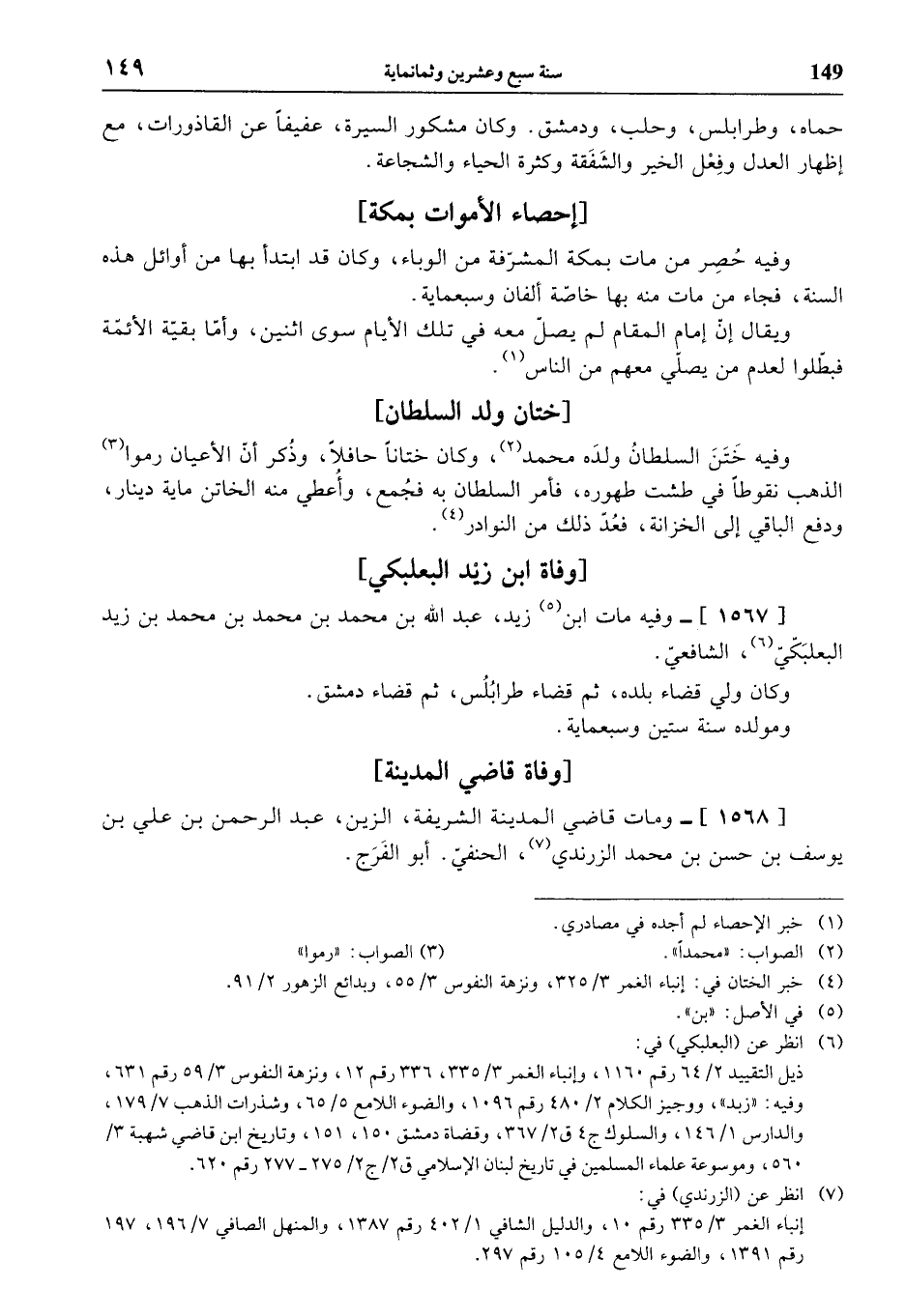 (¬6) انظر عن (البعلبكي) في: ذيل التقييد 2/ 64 رقم 1160، وإنباء الغمر 3/ 335، 336 رقم 12، ونزهة النفوس 3/ 59 رقم 631، وفيه: «زبد»، ووجيز الكلام 2/ 480 رقم 1096، والضوء اللامع 5/ 65، وشذرات الذهب 7/ 179، والدارس 1/ 146، والسلوك ج 4 ق 2/ 367، وقضاة دمشق 150، 151، وتاريخ ابن قاضي شهبة 3/ 560، وموسوعة علماء المسلمين في تاريخ لبنان الإسلامي ق 2 / ج 2/ 275 - 277 رقم 620.