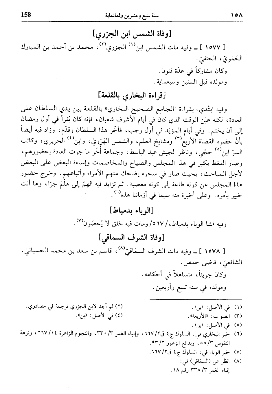 (¬6) خبر البخاري في: السلوك ج 4 ق 2/ 667، وإنباء الغمر 3/ 330، والنجوم الزاهرة 14/ 267، ونزهة النفوس 3/ 55، وبدائع الزهور 2/ 93.
