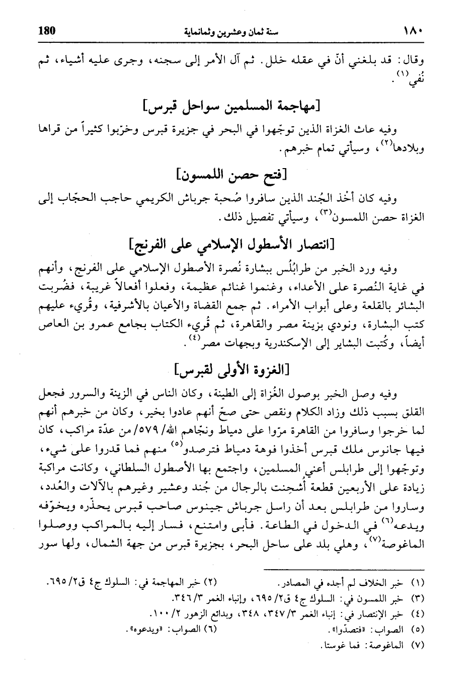 وفيه عاث الغزاة الذين توجّهوا في البحر في جزيرة قبرس وخرّبوا كثيرا من قراها وبلادها (¬2)، وسيأتي تمام خبرهم.