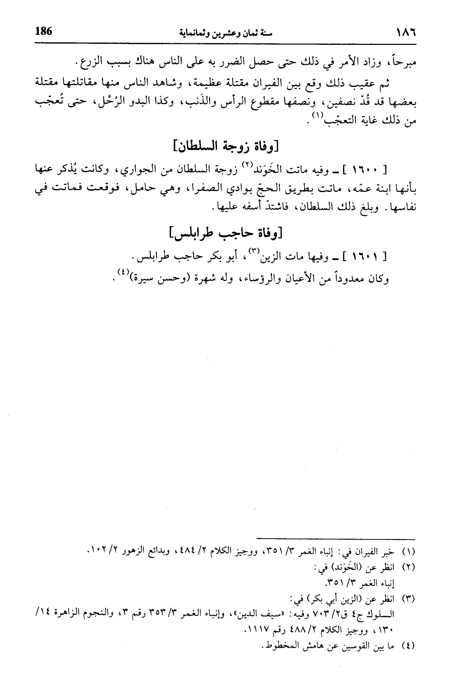[1600]- وفيه ماتت الخوند (¬2) زوجة السلطان من الجواري، وكانت يذكر عنها بأنها ابنة عمّه، ماتت بطريق الحجّ بوادي الصفرا، وهي حامل، فوقعت فماتت في نفاسها. وبلغ ذلك السلطان، فاشتدّ أسفه عليها.