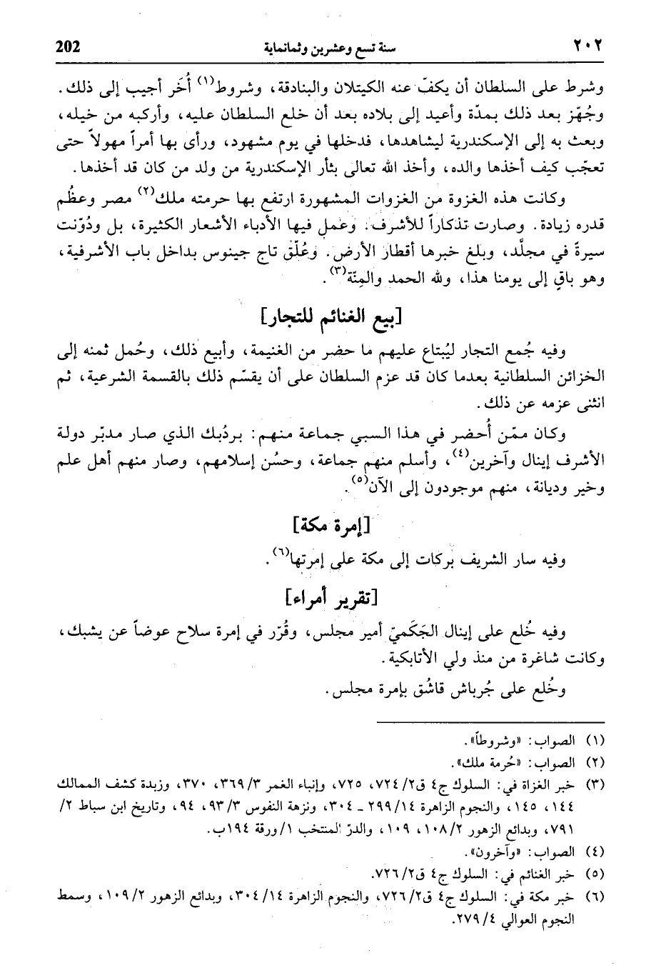 (¬3) خبر الغزاة في: السلوك ج 4 ق 2/ 724، 725، وإنباء الغمر 3/ 369، 370، وزبدة كشف الممالك 144، 145، والنجوم الزاهرة 14/ 299 - 304، ونزهة النفوس 3/ 93، 94، وتاريخ ابن سباط 2/ 791، وبدائع الزهور 2/ 108، 109، والدرّ المنتخب 1 / ورقة 194 ب.